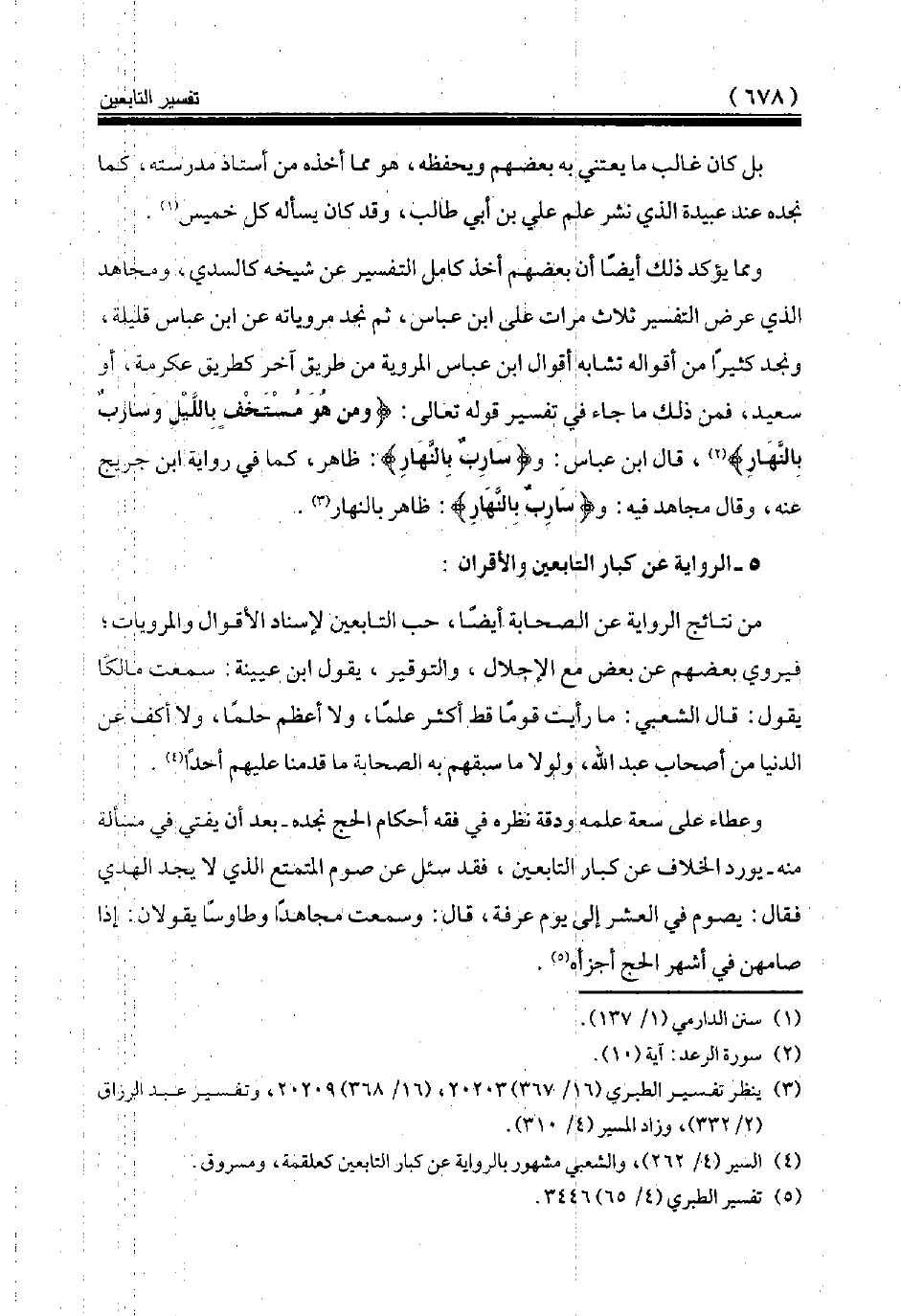 ومما يؤكد ذلك أيضا أن بعضهم أخذ كامل التفسير عن شيخه كالسدي، ومجاهد الذي عرض التفسير ثلاث مرات على ابن عباس، ثم نجد مروياته عن ابن عباس قليلة، ونجد كثيرا من أقواله تشابه أقوال ابن عباس المروية من طريق آخر كطريق عكرمة، أو سعيد، فمن ذلك ما جاء في تفسير قوله تعالى: {وَمَنْ هُوَ مُسْتَخْفٍ بِاللَّيْلِ وَسَارِبٌ بِالنَّهَارِ} (¬2)، قال ابن عباس: و {سَارِبٌ بِالنَّهَارِ}: ظاهر، كما في رواية ابن جريج عنه، وقال مجاهد فيه: و {سَارِبٌ بِالنَّهَارِ}: ظاهر بالنهار (¬3).