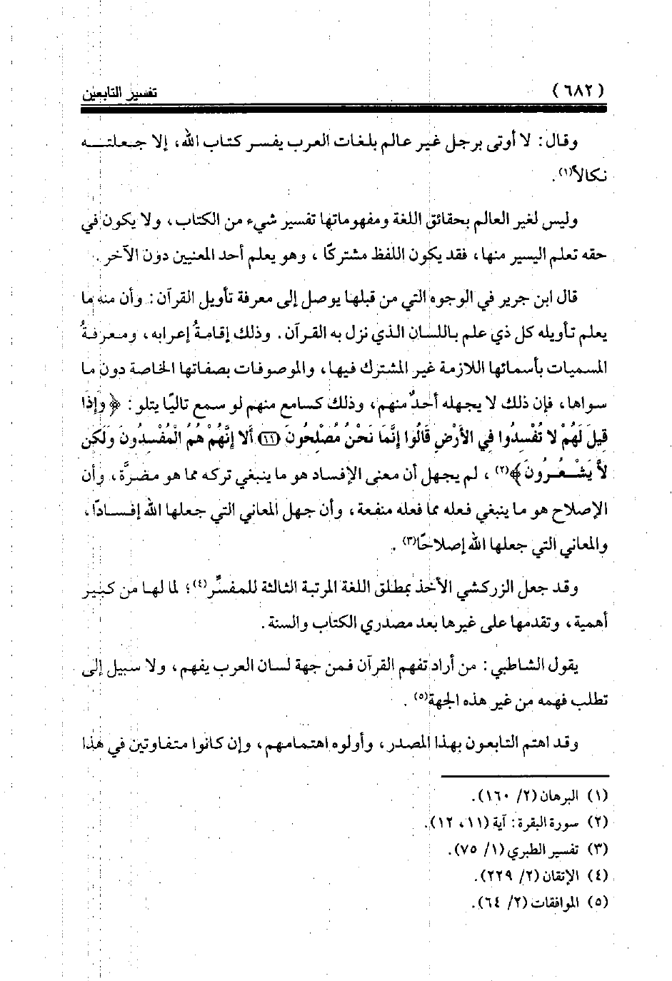 قال ابن جرير في الوجوه التي من قبلها يوصل إلى معرفة تأويل القرآن: وأن منه ما يعلم تأويله كل ذي علم باللسان الذي نزل به القرآن. وذلك إقامة إعرابه، ومعرفة المسميات بأسمائها اللازمة غير المشترك فيها، والموصوفات بصفاتها الخاصة دون ما سواها، فإن ذلك لا يجهله أحد منهم، وذلك كسامع منهم لو سمع تاليا يتلو: {وَإِذَا قِيلَ لَهُمْ لَا تُفْسِدُوا فِي الْأَرْضِ قَالُوا إِنَّمَا نَحْنُ مُصْلِحُونَ (11) أَلَا إِنَّهُمْ هُمُ الْمُفْسِدُونَ وَلَكِنْ لَا يَشْعُرُونَ} (¬2)، لم يجهل أن معنى الإفساد هو ما ينبغي تركه مما هو مضرّة، وأن الإصلاح هو ما ينبغي فعله مما فعله منفعة، وأن جهل المعاني التي جعلها الله إفسادا، والمعاني التي جعلها الله إصلاحا (¬3).