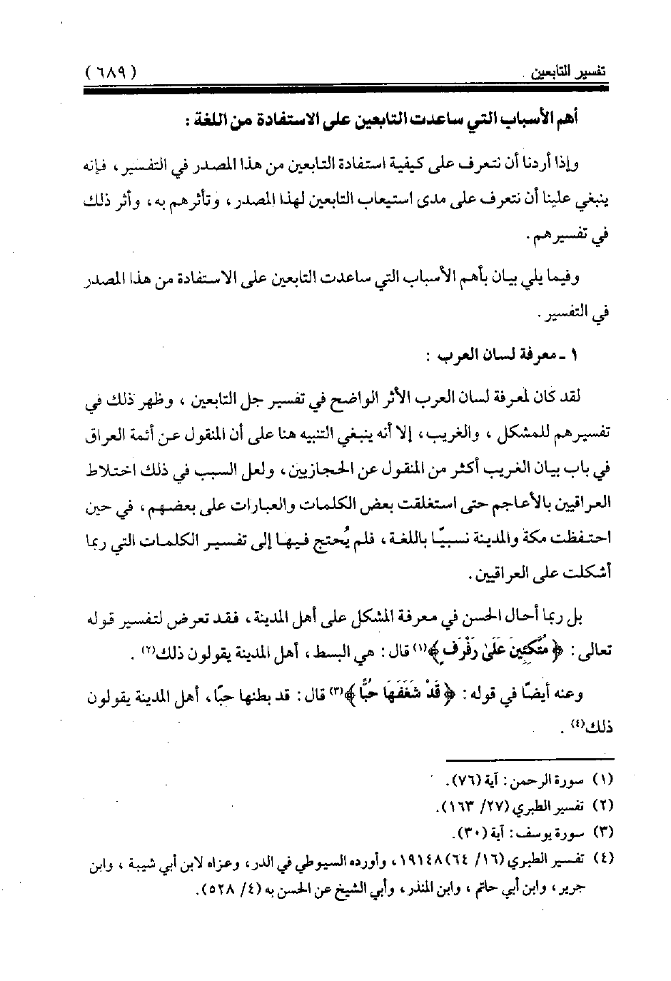 بل ربما أحال الحسن في معرفة المشكل على أهل المدينة، فقد تعرض لتفسير قوله تعالى: {مُتَّكِئِينَ عَلى َ رَفْرَفٍ} (¬1) قال: هي البسط، أهل المدينة يقولون ذلك (¬2).