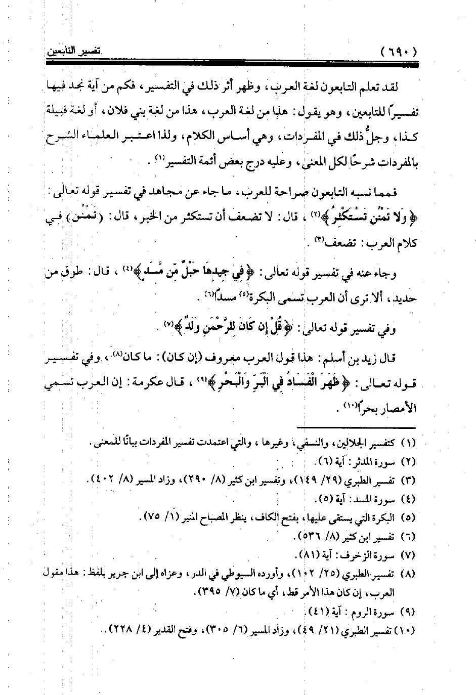 لقد تعلم التابعون لغة العرب، وظهر أثر ذلك في التفسير، فكم من آية نجد فيها تفسيرا للتابعين، وهو يقول: هذا من لغة العرب، هذا من لغة بني فلان، أو لغة قبيلة كذا، وجلّ ذلك في المفردات، وهي أساس الكلام، ولذا اعتبر العلماء الشرح بالمفردات شرحا لكل المعنى، وعليه درج بعض أئمة التفسير (¬1).