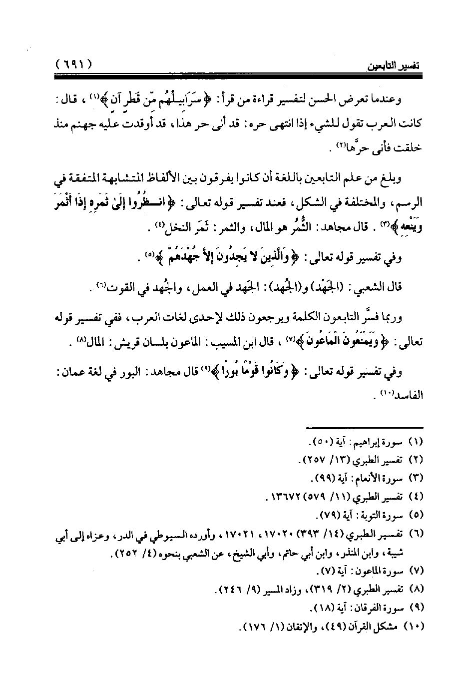 وبلغ من علم التابعين باللغة أن كانوا يفرقون بين الألفاظ المتشابهة المتفقة في الرسم، والمختلفة في الشكل، فعند تفسير قوله تعالى: {انْظُرُوا إِلى َ ثَمَرِهِ إِذَا أَثْمَرَ وَيَنْعِهِ} (¬3). قال مجاهد: الثّمر هو المال، والثمر: ثمر النخل (¬4).