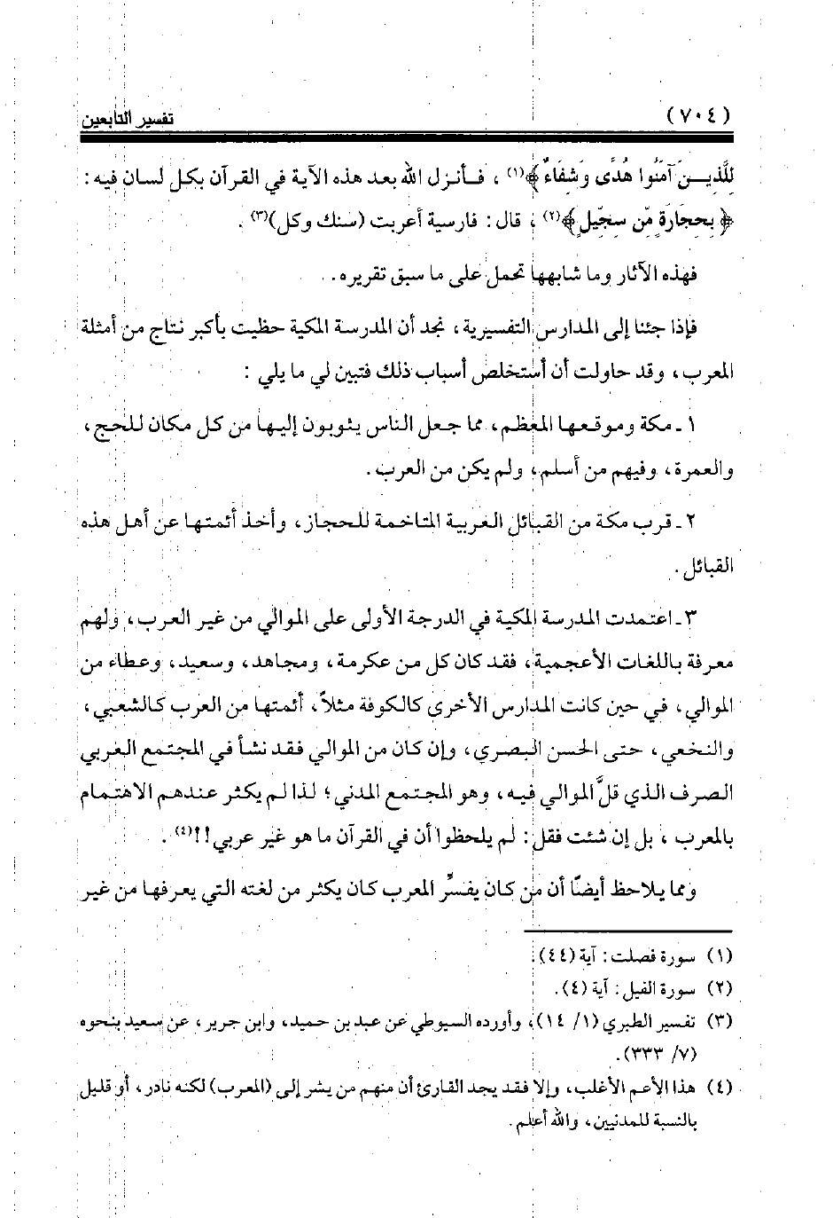 3 - اعتمدت المدرسة المكية في الدرجة الأولى على الموالي من غير العرب، ولهم معرفة باللغات الأعجمية، فقد كان كل من عكرمة، ومجاهد، وسعيد، وعطاء من الموالي، في حين كانت المدارس الأخرى كالكوفة مثلا، أئمتها من العرب كالشعبي، والنخعي، حتى الحسن البصري، وإن كان من الموالي فقد نشأ في المجتمع العربي الصرف الذي قلّ الموالي فيه، وهو المجتمع المدني لذا لم يكثر عندهم الاهتمام بالمعرب، بل إن شئت فقل: لم يلحظوا أن في القرآن ما هو غير عربي!! (¬4).
