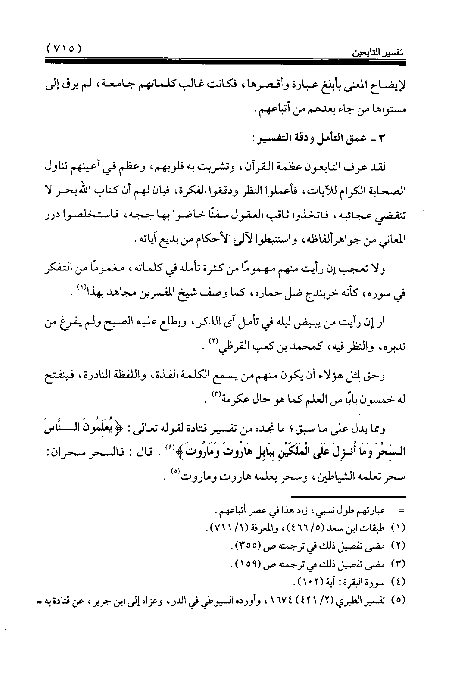 ومما يدل على ما سبق ما نجده من تفسير قتادة لقوله تعالى: {يُعَلِّمُونَ النَّاسَ السِّحْرَ وَمَا أُنْزِلَ عَلَى الْمَلَكَيْنِ بِبَابِلَ هَارُوتَ وَمَارُوتَ} (¬4). قال: فالسحر سحران: