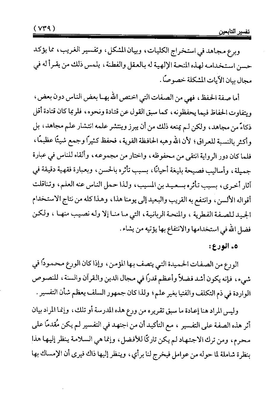 وليس المراد هنا إعادة ما سبق تقريره من ورع هذه المدرسة أو تلك، وإنما المراد بيان أثر هذه الصفة على التفسير، مع التأكيد أن من اجتهد في التفسير لم يكن مقدما على محرم، ومن ترك الاجتهاد لم يكن تاركا للأفضل، وإنما هي السلامة ينظر إليها هذا بنظرة شاملة لما حوله من عوامل فيخرج لنا برأي، وينظر إليها ذاك فيرى أن الإمساك بها