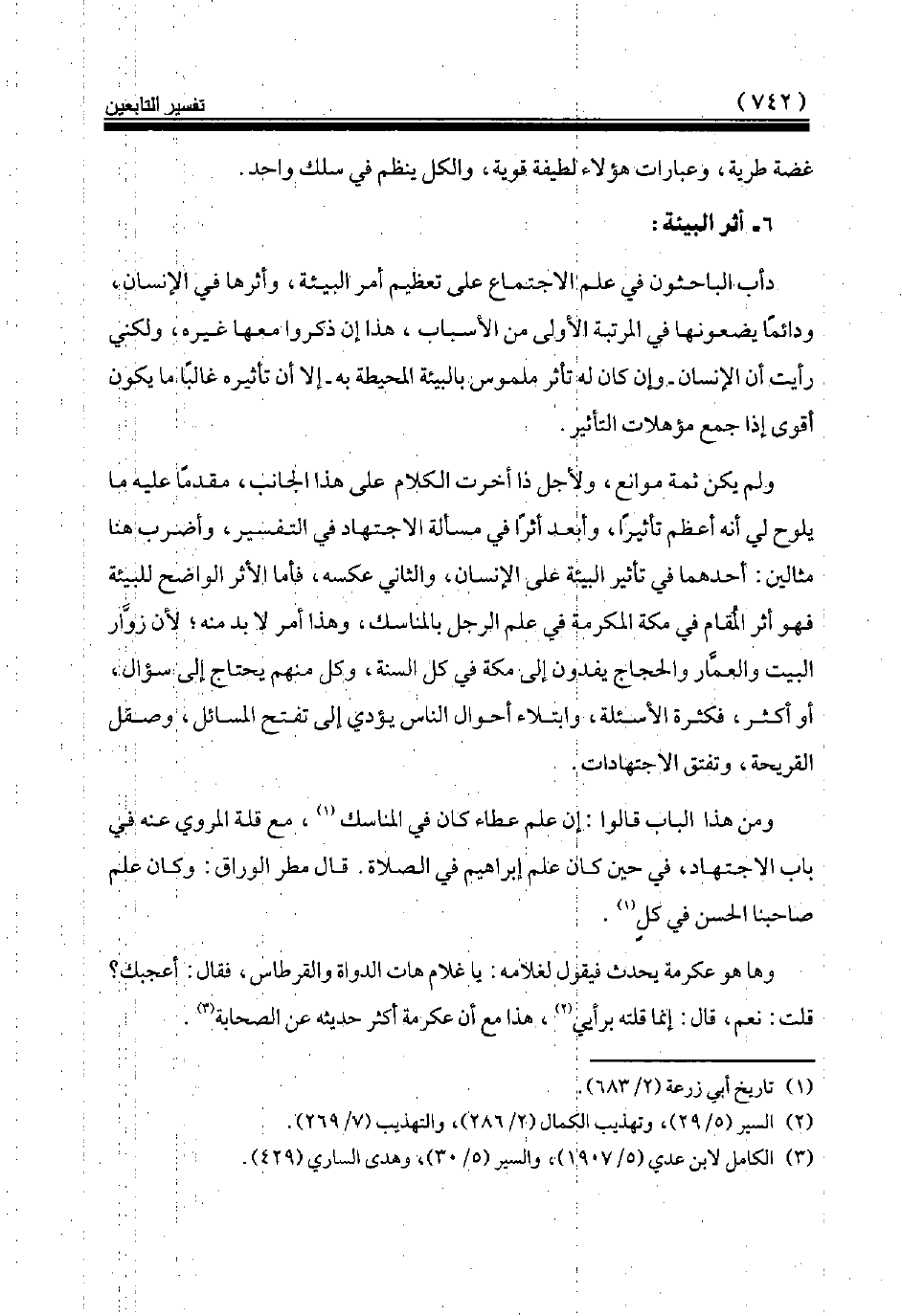 ولم يكن ثمة موانع، ولأجل ذا أخرت الكلام على هذا الجانب، مقدما عليه ما يلوح لي أنه أعظم تأثيرا، وأبعد أثرا في مسألة الاجتهاد في التفسير، وأضرب هنا مثالين: أحدهما في تأثير البيئة على الإنسان، والثاني عكسه، فأما الأثر الواضح للبيئة فهو أثر المقام في مكة المكرمة في علم الرجل بالمناسك، وهذا أمر لا بد منه لأن زوّار البيت والعمّار والحجاج يفدون إلى مكة في كل السنة، وكل منهم يحتاج إلى سؤال، أو أكثر، فكثرة الأسئلة، وابتلاء أحوال الناس يؤدي إلى تفتح المسائل، وصقل القريحة، وتفتق الاجتهادات.