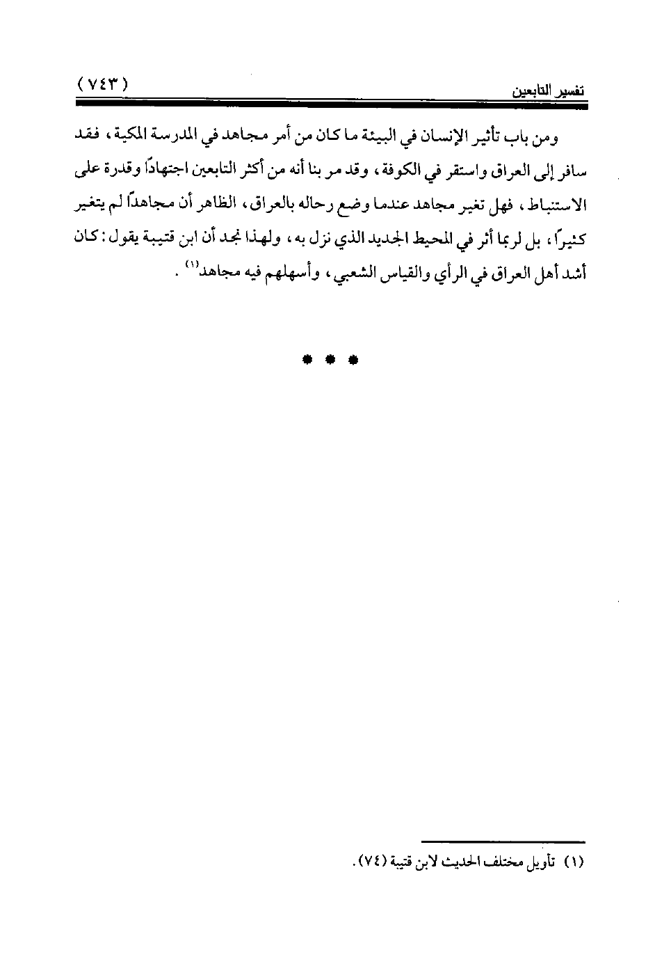 ومن باب تأثير الإنسان في البيئة ما كان من أمر مجاهد في المدرسة المكية، فقد سافر إلى العراق واستقر في الكوفة، وقد مر بنا أنه من أكثر التابعين اجتهادا وقدرة على الاستنباط، فهل تغير مجاهد عند ما وضع رحاله بالعراق، الظاهر أن مجاهدا لم يتغير كثيرا، بل لربما أثر في المحيط الجديد الذي نزل به، ولهذا نجد أن ابن قتيبة يقول: كان أشد أهل العراق في الرأي والقياس الشعبي، وأسهلهم فيه مجاهد (¬1).