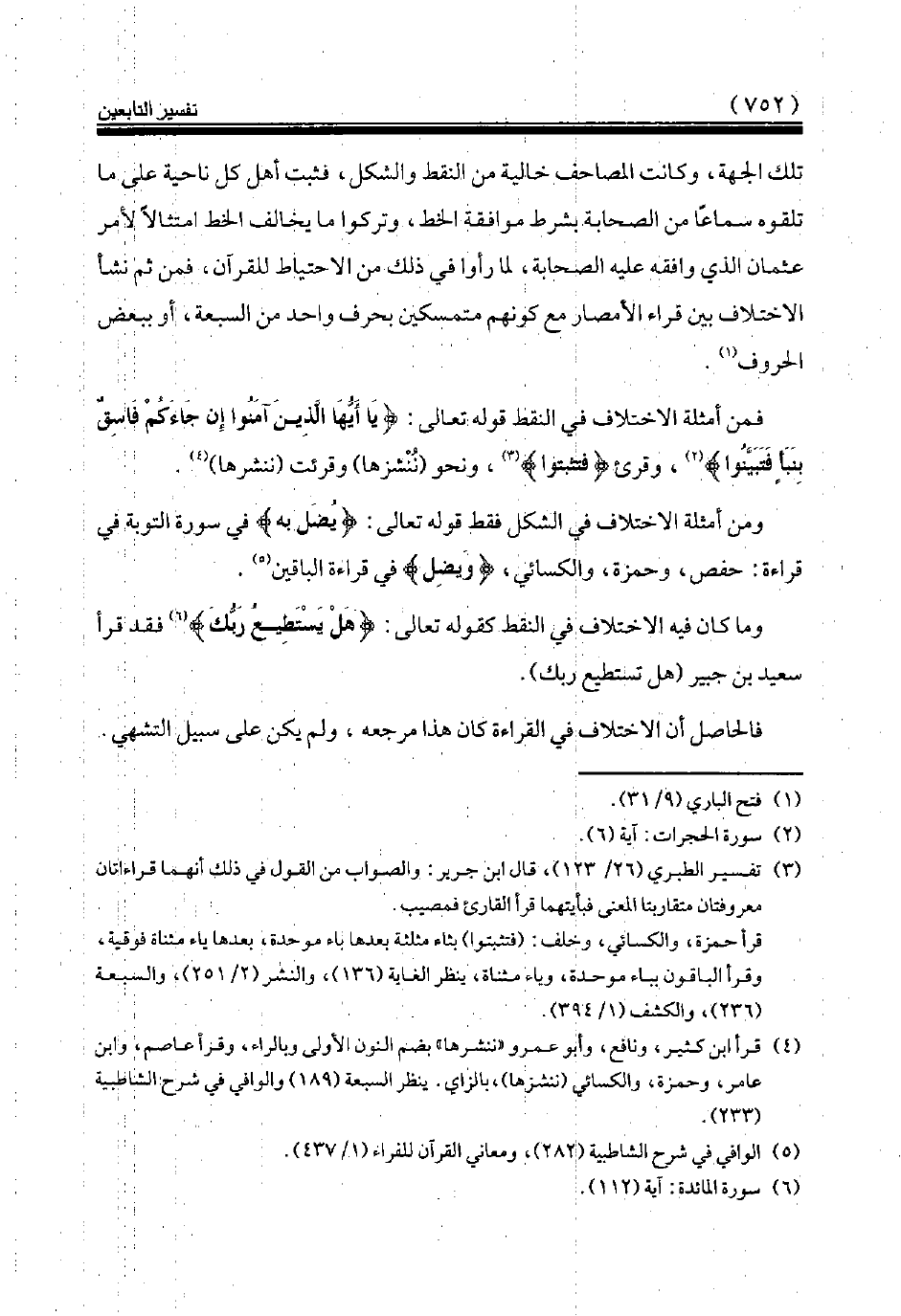 فمن أمثلة الاختلاف في النقط قوله تعالى: {يَا أَيُّهَا الَّذِينَ آمَنُوا إِنْ جَاءَكُمْ فَاسِقٌ بِنَبَإٍ فَتَبَيَّنُوا} (¬2)، وقرئ فتثبتوا (¬3)، ونحو (ننشزها) وقرئت (ننشرها) (¬4).