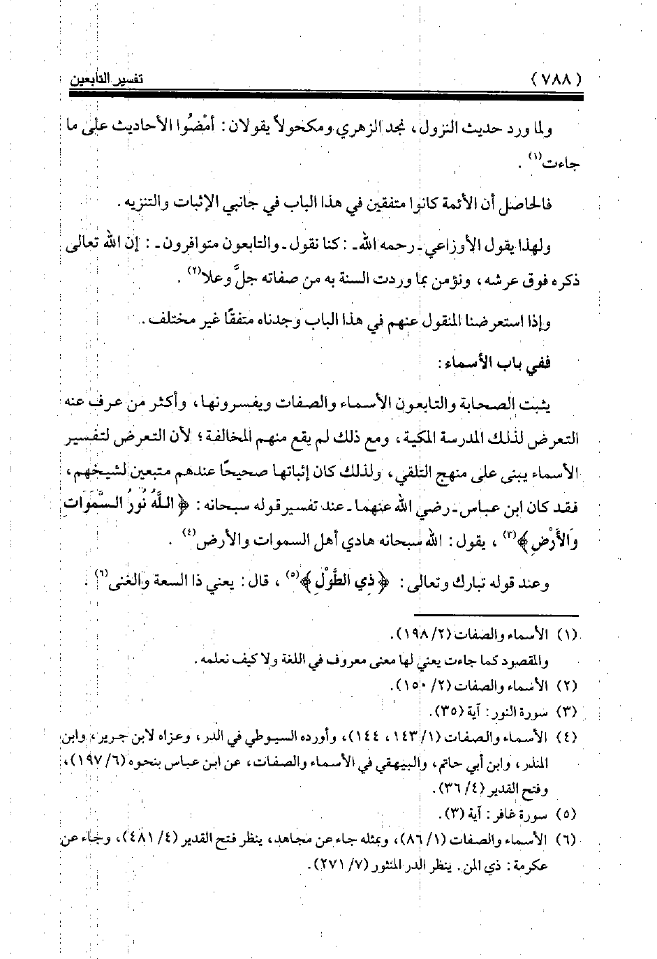 يثبت الصحابة والتابعون الأسماء والصفات ويفسرونها، وأكثر من عرف عنه التعرض لذلك المدرسة المكية، ومع ذلك لم يقع منهم المخالفة لأن التعرض لتفسير الأسماء يبنى على منهج التلقي، ولذلك كان إثباتها صحيحا عندهم متبعين لشيخهم، فقد كان ابن عباس رضي الله عنهما عند تفسير قوله سبحانه: {اللَّهُ نُورُ السَّمَاوَاتِ وَالْأَرْضِ} (¬3)، يقول: الله سبحانه هادي أهل السموات والأرض (¬4).