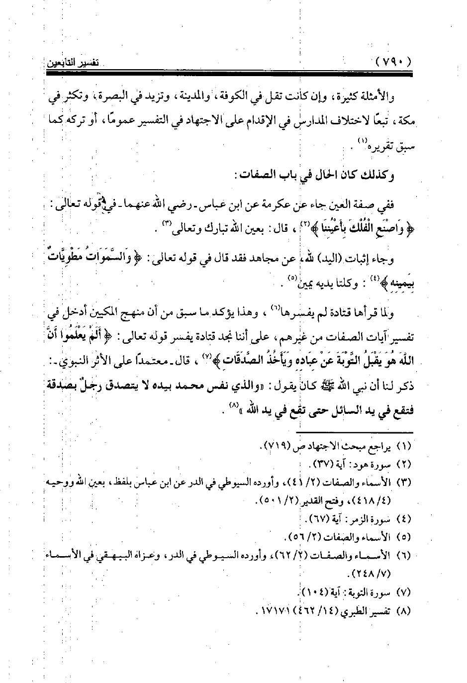 وجاء إثبات (اليد) لله، عن مجاهد فقد قال في قوله تعالى: {وَالسَّمَاوَاتُ مَطْوِيَّاتٌ بِيَمِينِهِ} (¬4): وكلتا يديه يمين (¬5).