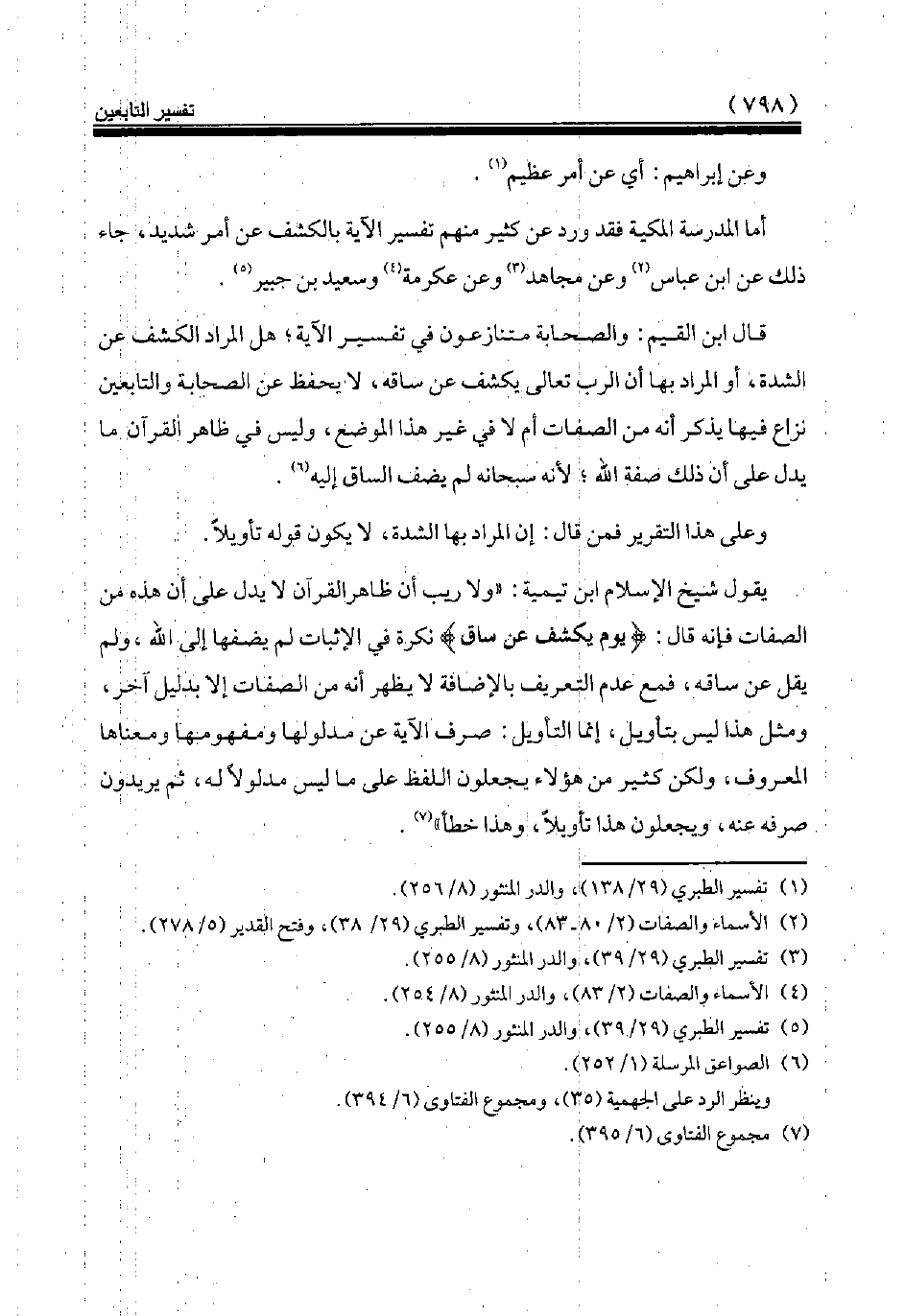قال ابن القيم: والصحابة متنازعون في تفسير الآية هل المراد الكشف عن الشدة، أو المراد بها أن الرب تعالى يكشف عن ساقه، لا يحفظ عن الصحابة والتابعين نزاع فيها يذكر أنه من الصفات أم لا في غير هذا الموضع، وليس في ظاهر القرآن ما يدل على أن ذلك صفة الله لأنه سبحانه لم يضف الساق إليه (¬6).