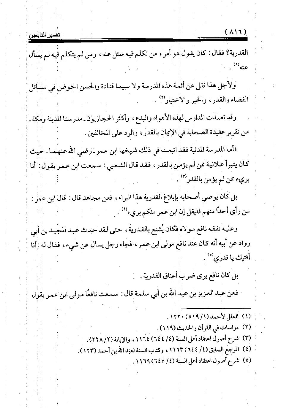 فأما المدرسة المدنية فقد اتبعت في ذلك شيخها ابن عمر رضي الله عنهما حيث كان يتبرأ علانية ممن لم يؤمن بالقدر، فقد قال الشعبي: سمعت ابن عمر يقول: أنا بريء ممن لم يؤمن بالقدر (¬3).