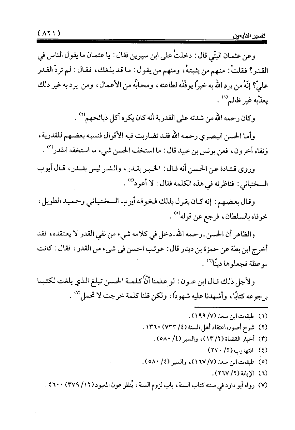 وعن عثمان البتّي قال: دخلت على ابن سيرين فقال: يا عثمان ما يقول الناس في القدر فقلت: منهم من يثبته، ومنهم من يقول: ما قد بلغك، فقال: لم تردّ القدر عليّ إنّه من يرد الله به خيرا يوفّقه لطاعته، ومحابّه من الأعمال، ومن يرد به غير ذلك يعذّبه غير ظالم (¬1).