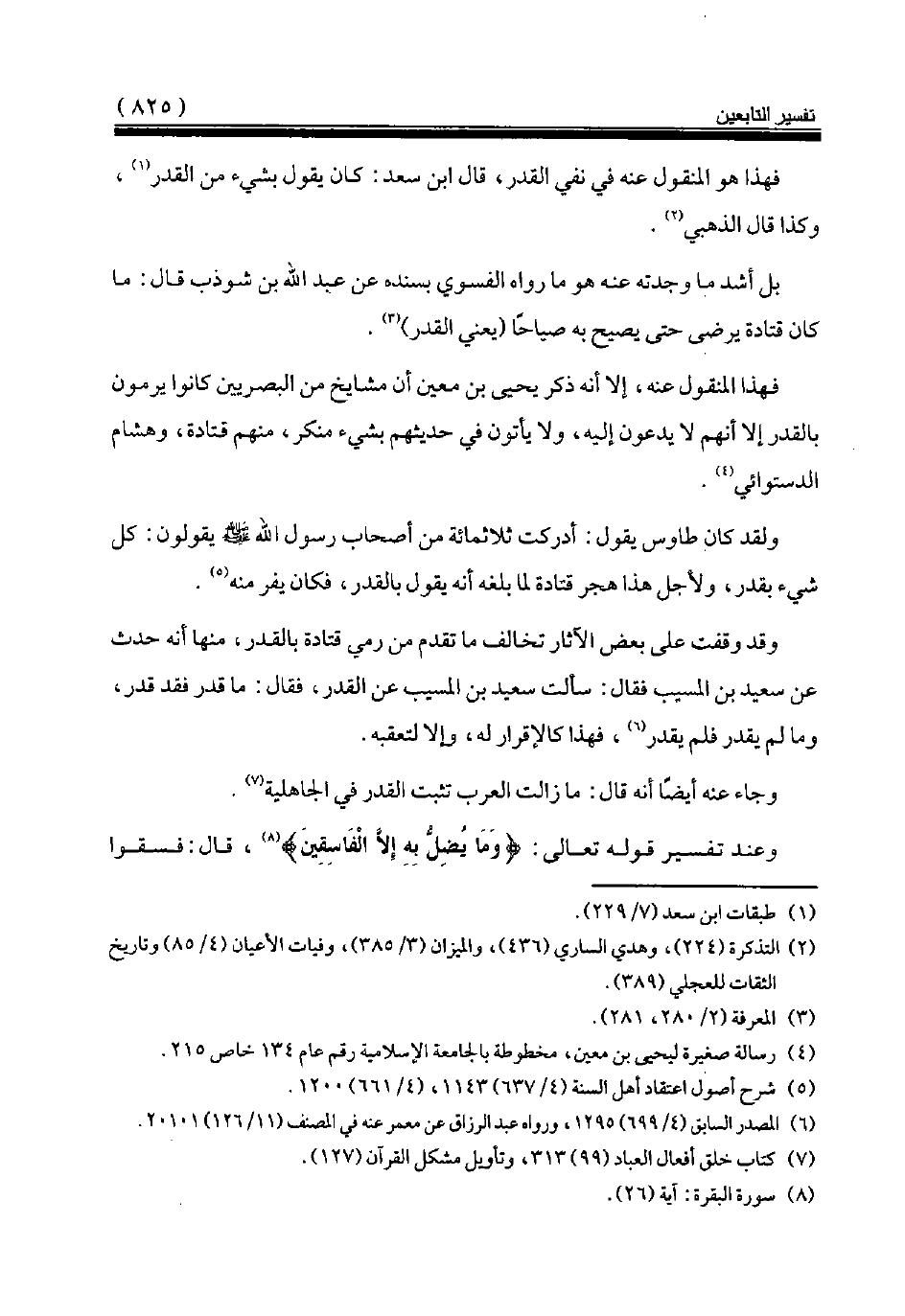 ولقد كان طاوس يقول: أدركت ثلاثمائة من أصحاب رسول الله صلى الله عليه وسلم يقولون: كل شيء بقدر، ولأجل هذا هجر قتادة لما بلغه أنه يقول بالقدر، فكان يفر منه (¬5).