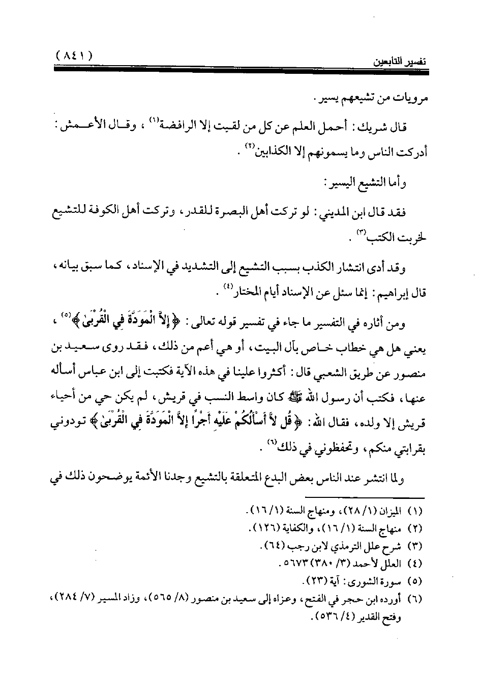 ومن أثاره في التفسير ما جاء في تفسير قوله تعالى: {إِلَّا الْمَوَدَّةَ فِي الْقُرْبى َ} (¬5)، يعني هل هي خطاب خاص بآل البيت، أو هي أعم من ذلك، فقد روى سعيد بن منصور عن طريق الشعبي قال: أكثروا علينا في هذه الآية فكتبت إلى ابن عباس أسأله عنها، فكتب أن رسول الله صلى الله عليه وسلم كان واسط النسب في قريش، لم يكن حي من أحياء قريش إلا ولده، فقال الله: {قُلْ لَا أَسْئَلُكُمْ عَلَيْهِ أَجْراً إِلَّا الْمَوَدَّةَ فِي الْقُرْبى َ} تودوني بقرابتي منكم، وتحفظوني في ذلك (¬6).