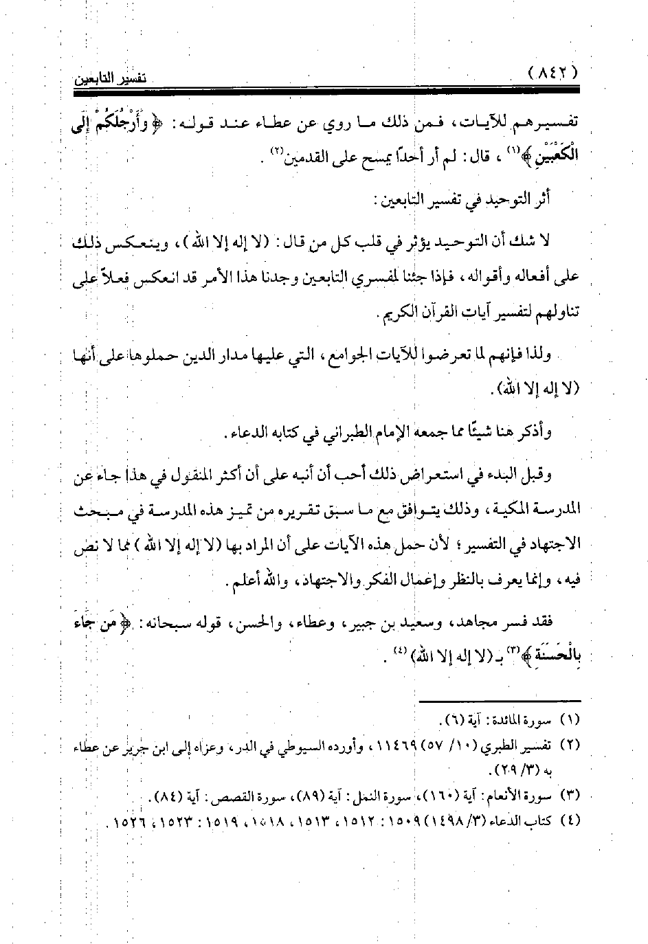 تفسيرهم للآيات، فمن ذلك ما روي عن عطاء عند قوله: {وَأَرْجُلَكُمْ إِلَى الْكَعْبَيْنِ} (¬1)، قال: لم أر أحدا يمسح على القدمين (¬2).