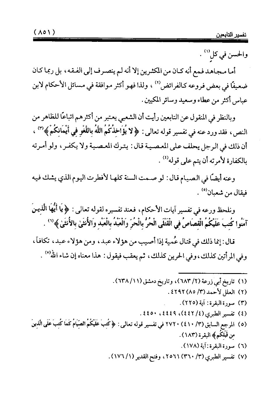 وبالنظر في المنقول عن التابعين رأيت أن الشعبي يعتبر من أكثرهم اتباعا للظاهر من النص، فقد ورد عنه في تفسير قوله تعالى: {لَا يُؤَاخِذُكُمُ اللَّهُ بِاللَّغْوِ فِي أَيْمَانِكُمْ} (¬3)، أن ذلك في الرجل يحلف على المعصية قال: يترك المعصية ولا يكفر، ولو أمرته بالكفارة لأمرته أن يتم على قوله (¬4).