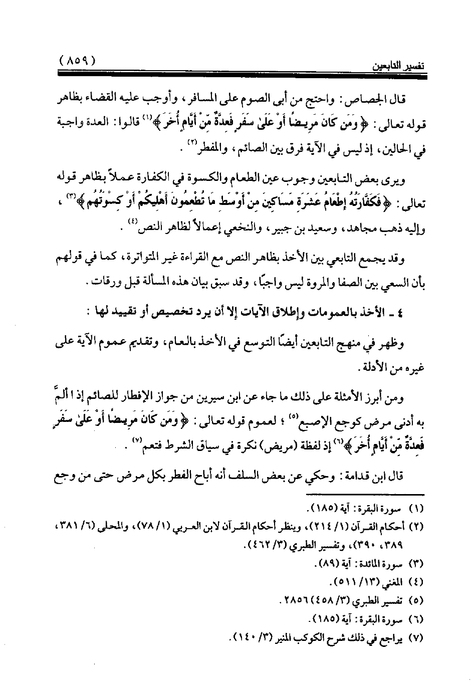 ومن أبرز الأمثلة على ذلك ما جاء عن ابن سيرين من جواز الإفطار للصائم إذا ألمّ به أدنى مرض كوجع الإصبع (¬5) لعموم قوله تعالى: {وَمَنْ كَانَ مَرِيضاً أَوْ عَلى َ سَفَرٍ فَعِدَّةٌ مِنْ أَيَّامٍ أُخَرَ} (¬6) إذ لفظة (مريض) نكرة في سياق الشرط فتعم (¬7).
