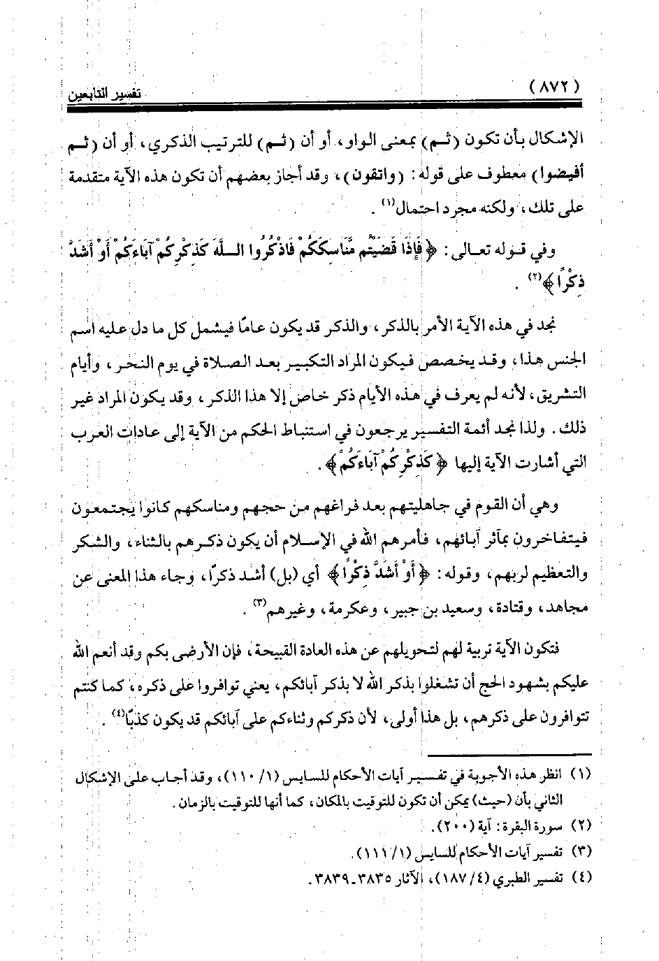 وفي قوله تعالى: {فَإِذَا قَضَيْتُمْ مَنَاسِكَكُمْ فَاذْكُرُوا اللَّهَ كَذِكْرِكُمْ آبَاءَكُمْ أَوْ أَشَدَّ ذِكْراً} (¬2).