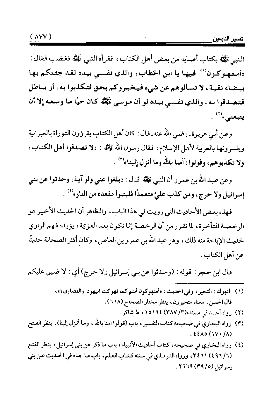 (¬4) رواه البخاري في صحيحه، كتاب أحاديث الأنبياء، باب ما ذكر عن بني إسرائيل، ينظر الفتح (6/ 496) 3461، ورواه الترمذي في سننه كتاب العلم، باب ما جاء في الحديث عن بني إسرائيل (5/ 39) 2669.