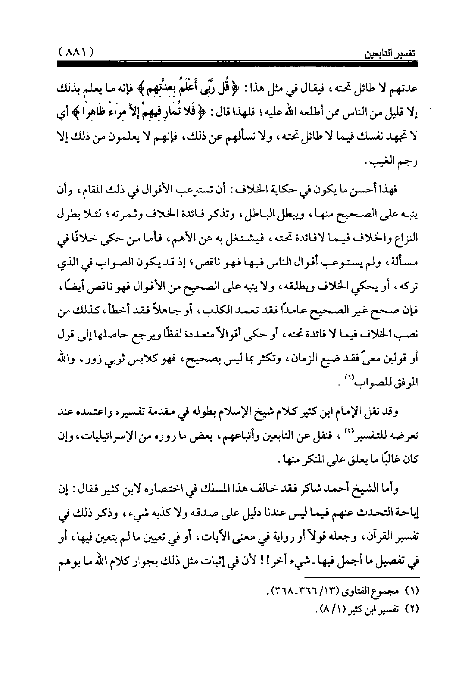 وأما الشيخ أحمد شاكر فقد خالف هذا المسلك في اختصاره لابن كثير فقال: إن إباحة التحدث عنهم فيما ليس عندنا دليل على صدقه ولا كذبه شيء، وذكر ذلك في تفسير القرآن، وجعله قولا أو رواية في معنى الآيات، أو في تعيين ما لم يتعين فيها، أو في تفصيل ما أجمل فيها شيء آخر!! لأن في إثبات مثل ذلك بجوار كلام الله ما يوهم