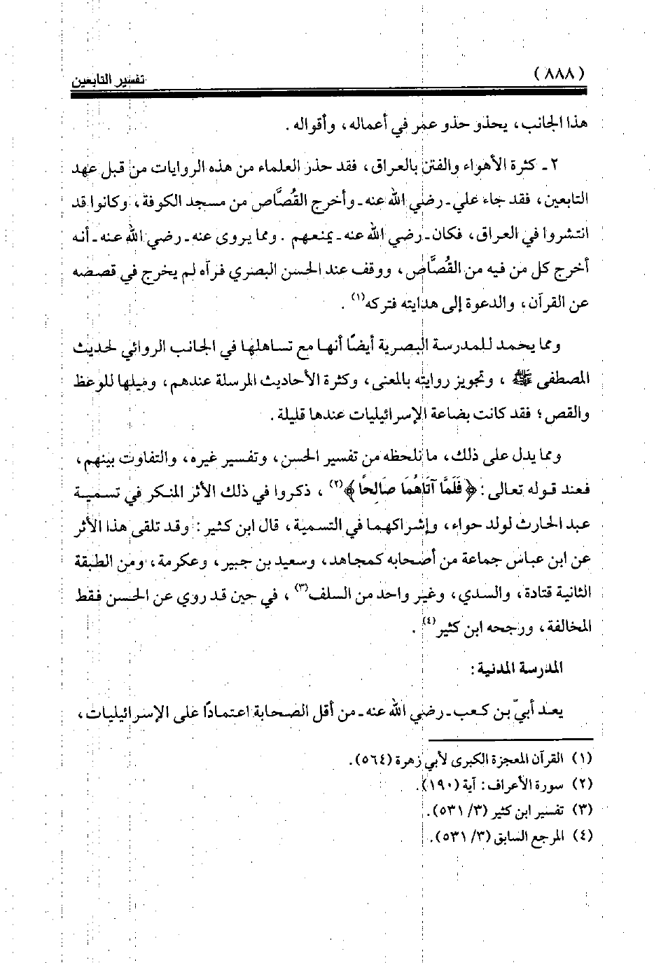 ومما يدل على ذلك، ما نلحظه من تفسير الحسن، وتفسير غيره، والتفاوت بينهم، فعند قوله تعالى: {فَلَمَّا آتَاهُمَا صَالِحاً} (¬2)، ذكروا في ذلك الأثر المنكر في تسمية عبد الحارث لولد حواء، وإشراكهما في التسمية، قال ابن كثير: وقد تلقى هذا الأثر عن ابن عباس جماعة من أصحابه كمجاهد، وسعيد بن جبير، وعكرمة، ومن الطبقة الثانية قتادة، والسدي، وغير واحد من السلف (¬3)، في حين قد روي عن الحسن فقط المخالفة، ورجحه ابن كثير (¬4).