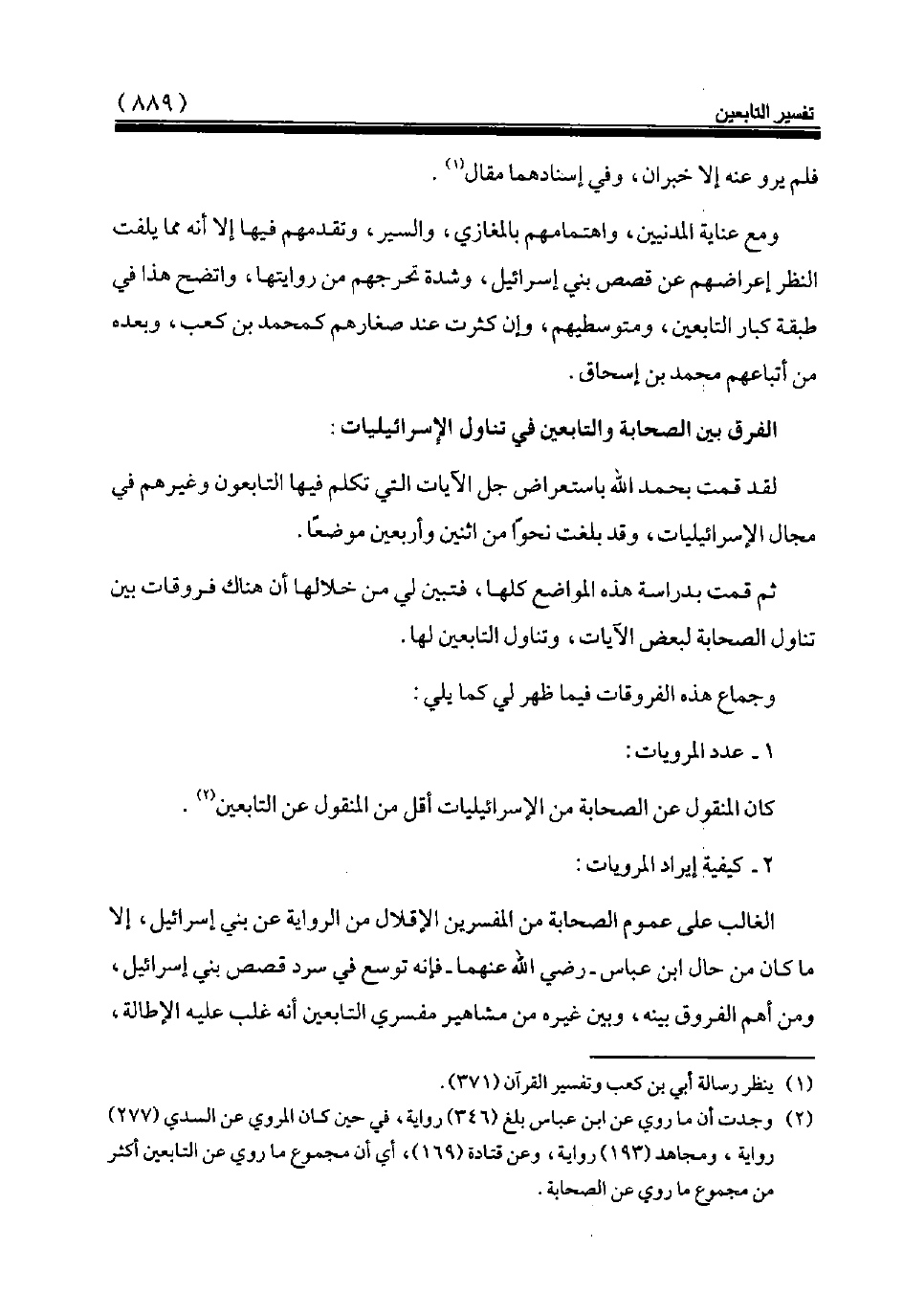 (¬2) وجدت أن ما روي عن ابن عباس بلغ (346) رواية، في حين كان المروي عن السدي (277) رواية، ومجاهد (193) رواية، وعن قتادة (169)، أي أن مجموع ما روي عن التابعين أكثر من مجموع ما روي عن الصحابة.