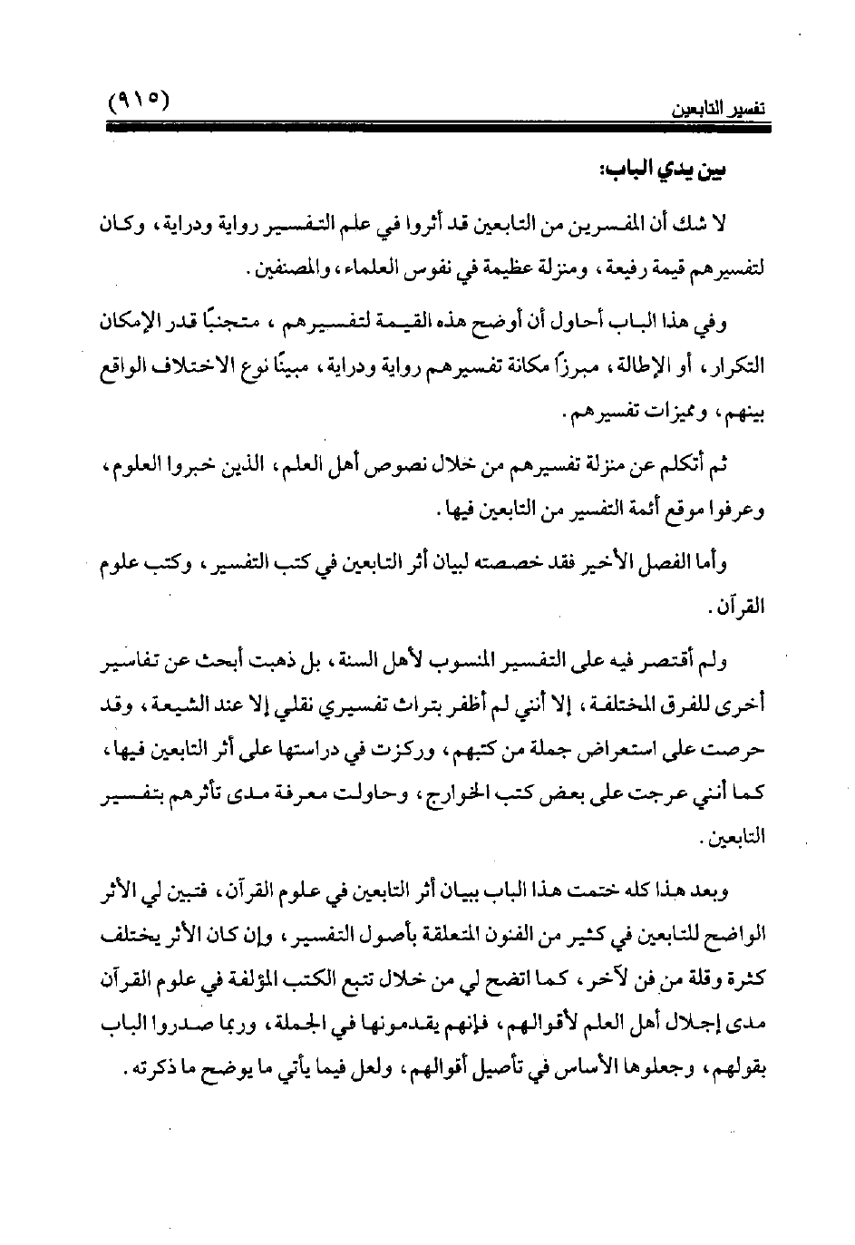 وبعد هذا كله ختمت هذا الباب ببيان أثر التابعين في علوم القرآن، فتبين لي الأثر الواضح للتابعين في كثير من الفنون المتعلقة بأصول التفسير، وإن كان الأثر يختلف كثرة وقلة من فن لآخر، كما اتضح لي من خلال تتبع الكتب المؤلفة في علوم القرآن مدى إجلال أهل العلم لأقوالهم، فإنهم يقدمونها في الجملة، وربما صدروا الباب بقولهم، وجعلوها الأساس في تأصيل أقوالهم، ولعل فيما يأتي ما يوضح ما ذكرته.