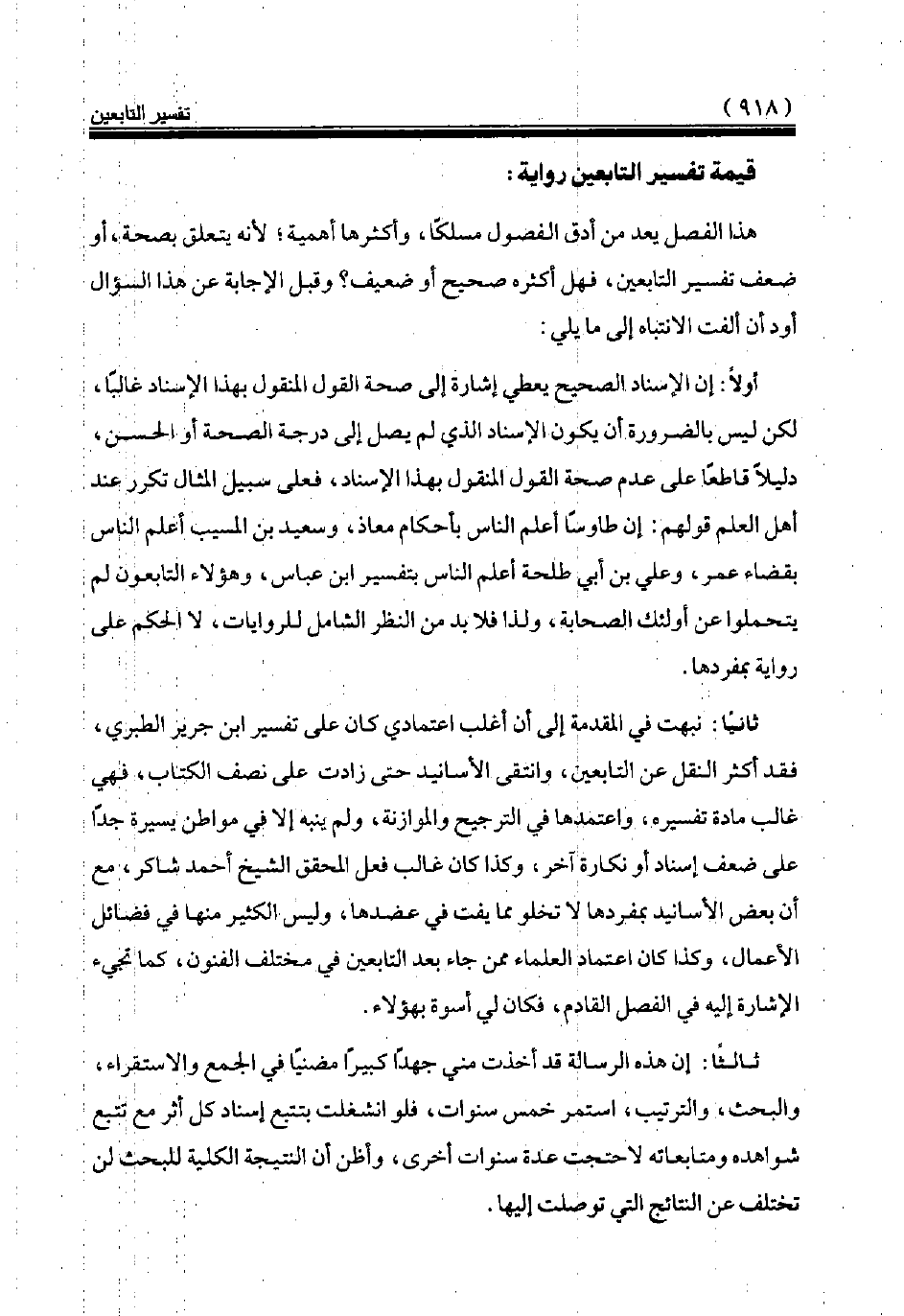 قيمة تفسير التابعين رواية: هذا الفصل يعد من أدق الفصول مسلكا، وأكثرها أهمية لأنه يتعلق بصحة، أو ضعف تفسير التابعين، فهل أكثره صحيح أو ضعيف وقبل الإجابة عن هذا السؤال أود أن ألفت الانتباه إلى ما يلي: