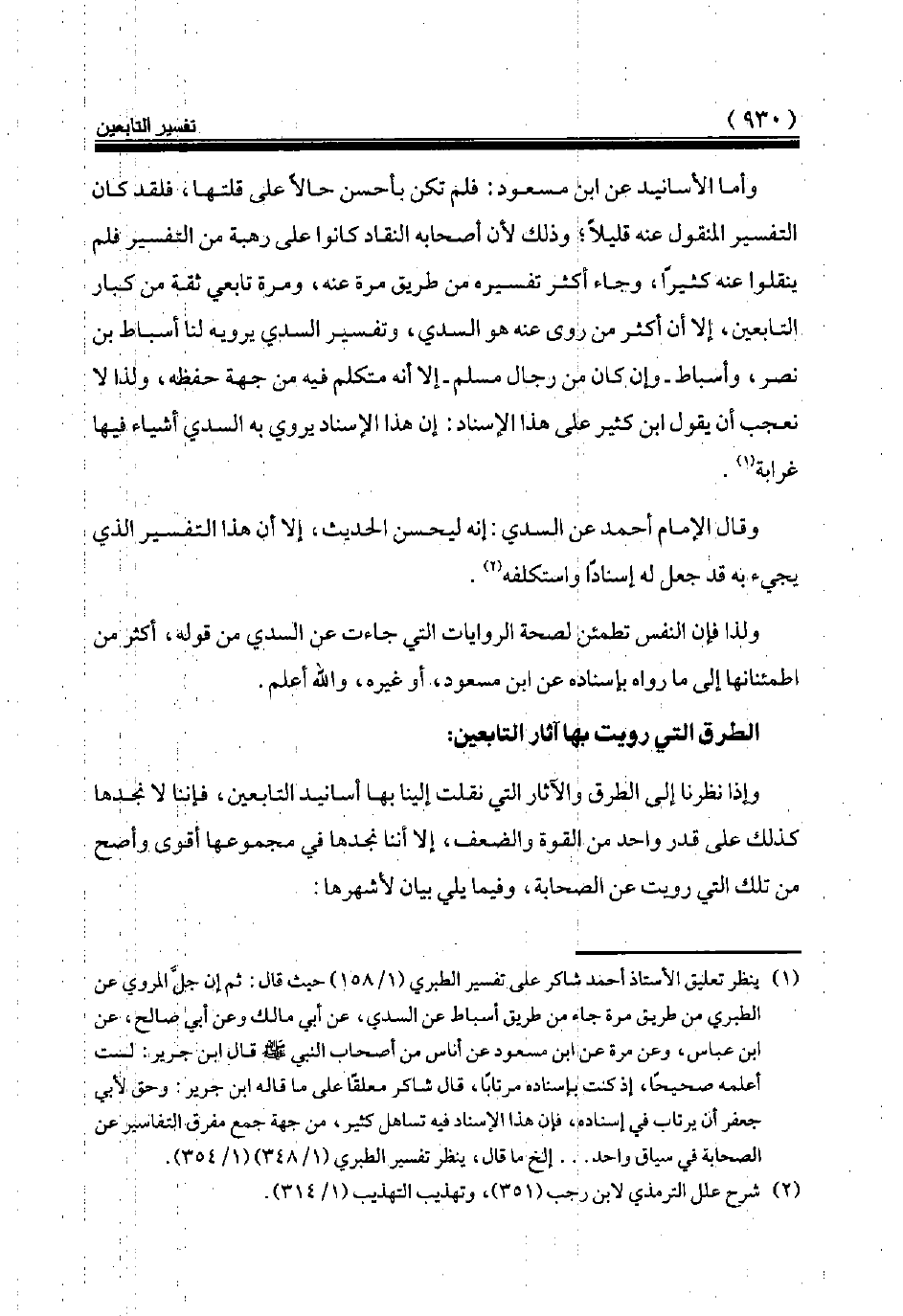 (¬1) ينظر تعليق الأستاذ أحمد شاكر على تفسير الطبري (1/ 158) حيث قال: ثم إن جلّ المروي عن الطبري من طريق مرة جاء من طريق أسباط عن السدي، عن أبي مالك وعن أبي صالح، عن ابن عباس، وعن مرة عن ابن مسعود عن أناس من أصحاب النبي صلى الله عليه وسلم قال ابن جرير: لست أعلمه صحيحا، إذ كنت بإسناده مرتابا، قال شاكر معلقا على ما قاله ابن جرير: وحق لأبي جعفر أن يرتاب في إسناده، فإن هذا الإسناد فيه تساهل كثير، من جهة جمع مفرق التفاسير عن الصحابة في سياق واحد إلخ ما قال، ينظر تفسير الطبري (1/ 348) (1/ 354).