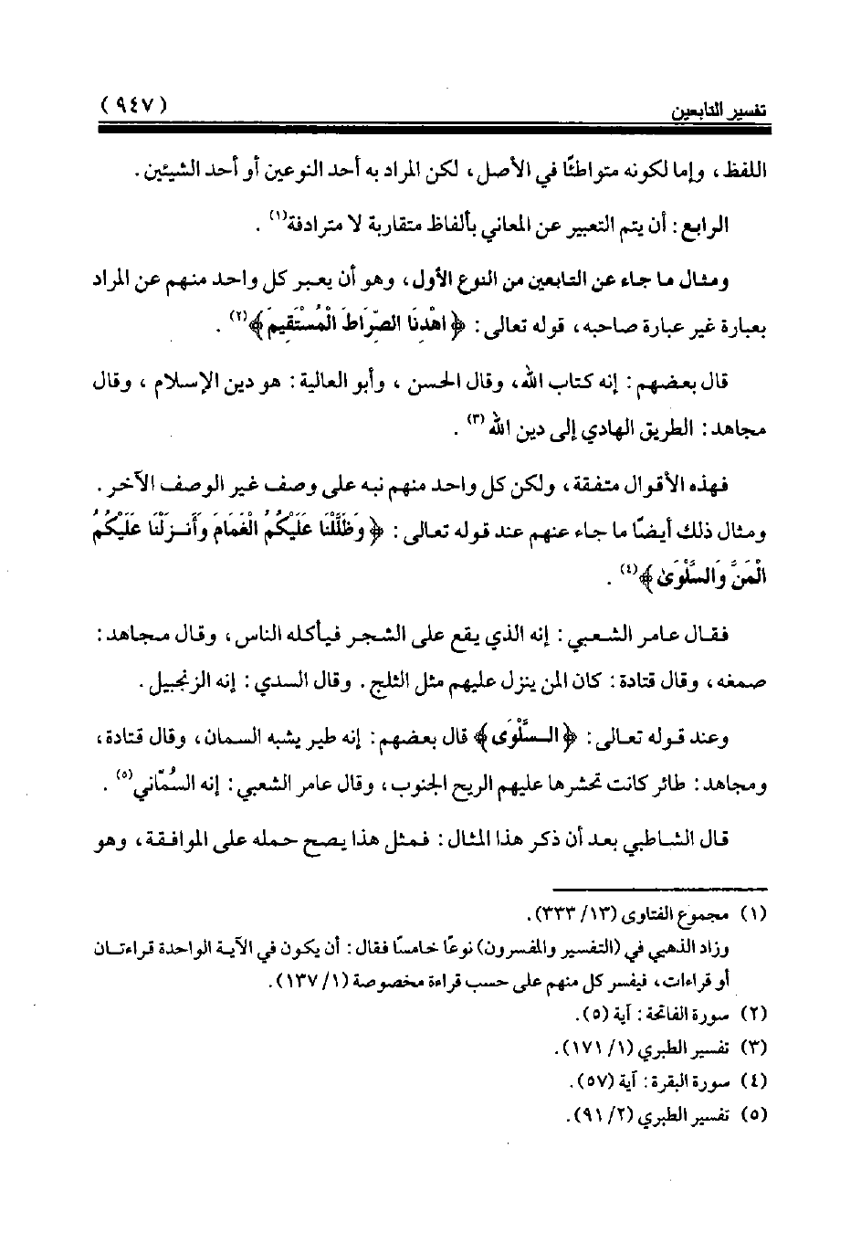 ومثال ما جاء عن التابعين من النوع الأول، وهو أن يعبر كل واحد منهم عن المراد بعبارة غير عبارة صاحبه، قوله تعالى: {اهْدِنَا الصِّرَاطَ الْمُسْتَقِيمَ} (¬2).