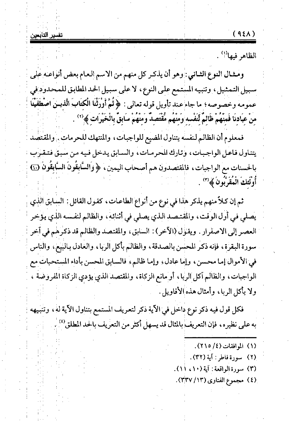 ثم إن كلا منهم يذكر هذا في نوع من أنواع الطاعات، كقول القائل: السابق الذي يصلي في أول الوقت، والمقتصد الذي يصلي في أثنائه، والظالم لنفسه الذي يؤخر العصر إلى الاصفرار. ويقول (الآخر): السابق، والمقتصد والظالم قد ذكرهم في آخر سورة البقرة، فإنه ذكر المحسن بالصدقة، والظالم بأكل الربا، والعادل بالبيع، والناس في الأموال إما محسن، وإما عادل، وإما ظالم، فالسابق المحسن بأداء المستحبات مع الواجبات، والظالم آكل الربا، أو مانع الزكاة، والمقتصد الذي يؤدي الزكاة المفروضة، ولا يأكل الربا، وأمثال هذه الأقاويل.