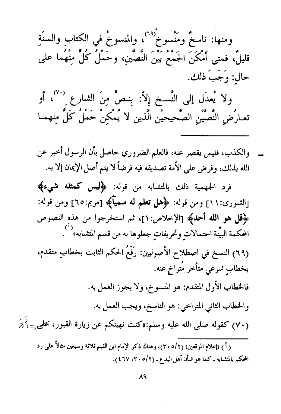 ولا يعدل إلى النسخ إلا بنص من الشارع، أو تعارض النصين الصحيحين الذين لايمكن حمل كل منهما
