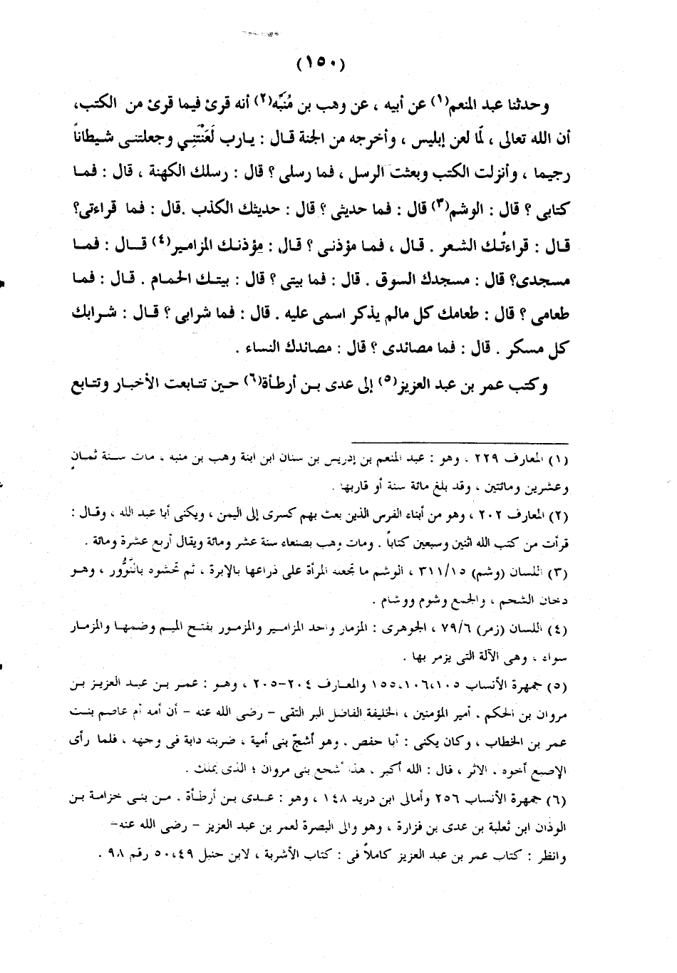 وَحَدَّثَنَا عَبْدُ الْمُنْعِمِ عَنْ أَبِيهِ عَنْ وَهْبِ بْنِ مُنَبِّهٍ أَنَّهُ قَرَأَ فِيمَا قَرَأَ مِنَ الْكُتُبِ أَنَّ اللَّهَ تَعَالَى لَمَّا لَعَنَ إِبْلِيسَ وَأَخْرَجَهُ مِنَ الْجَنَّةِ قَالَ يَا رَبِّ لَعَنْتَنِي وَجَعَلْتَنِي شَيْطَانًا رجيما وأنزلت الكتاب وَبَعَثْتَ الرُّسُلَ فَمَا رُسُلِي؟ قَالَ رُسُلُكَ الْكَهَنَةُ قَالَ فَمَا كِتَابِي؟ قال الْوَشْمُ قَالَ فَمَا حَدِيثِي؟ قَالَ حَدِيثُكَ الْكَذِبُ قَالَ فَمَا قِرَاءَتِي؟ قَالَ قِرَاءَتُكَ الشِّعْرُ قَالَ فَمَا مُؤَذِّنِي؟ قَالَ مُؤَذِّنُكَ الْمَزَامِيرُ قَالَ فَمَا مَسْجِدِي؟ قَالَ مَسْجِدُكَ السُّوقُ قَالَ فَمَا بَيْتِي؟ قَالَ بَيْتُكَ الْحَمَّامُ قَالَ فَمَا طَعَامِي؟ قَالَ طَعَامُكَ كُلُّ مَا لَمْ يُذْكَرِ اسْمِي عَلَيْهِ قَالَ فَمَا شَرَابِي؟ قَالَ شَرَابُكَ كُلُّ مُسْكِرٍ قَالَ فَمَا مَصَائِدِي؟ قَالَ مَصَائِدُكَ النِّسَاءُ.