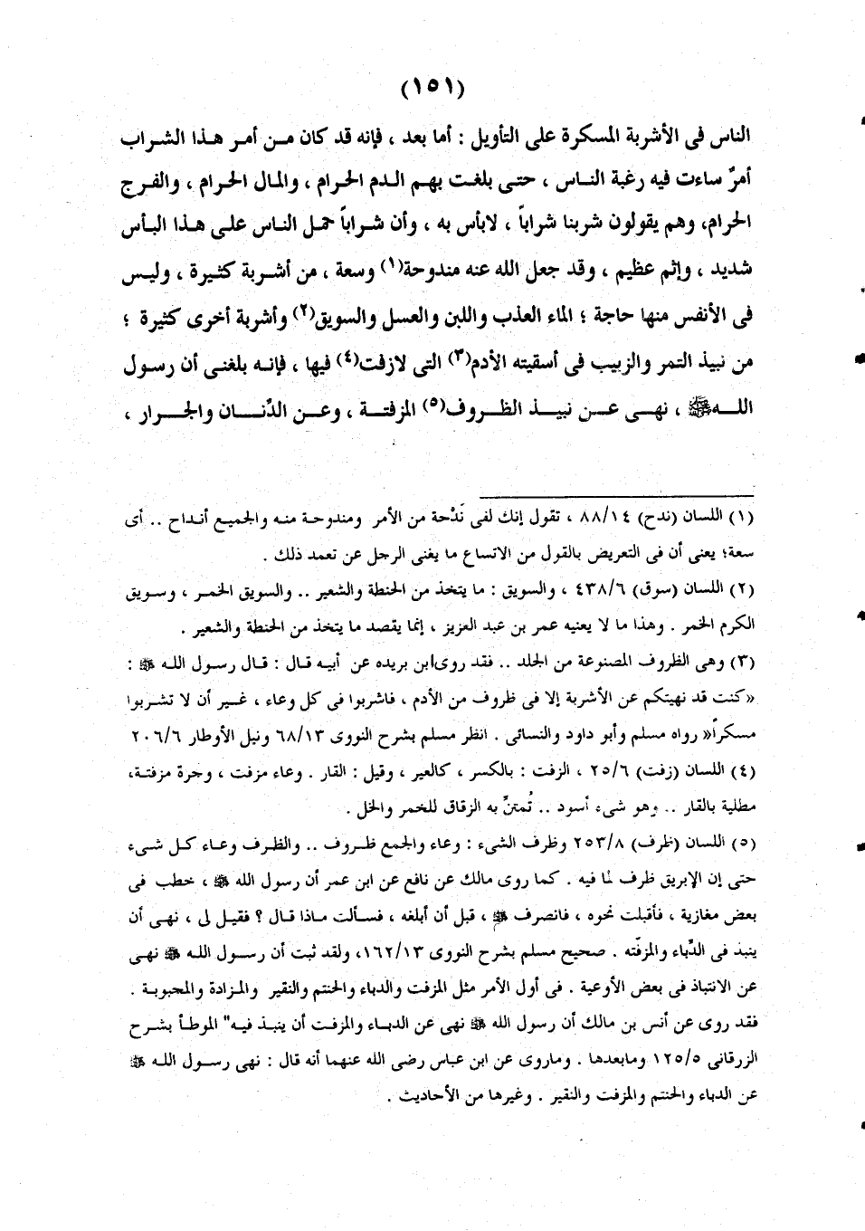 النَّاسُ فِي الْأَشْرِبَةِ الْمُسْكِرَةِ عَلَى التَّأْوِيلِ: أَمَّا بَعْدُ فَإِنَّهُ قَدْ كَانَ مِنْ أَمْرِ هَذَا الشَّرَابِ أَمْرٌ سَاءَتْ فِيهِ رَغْبَةُ النَّاسِ حَتَّى بَلَغَتْ بِهِمُ الدَّمَ الْحَرَامَ وَالْمَالَ الْحَرَامَ وَالْفَرْجَ الْحَرَامَ وَهُمْ يَقُولُونَ شَرِبْنَا شَرَابًا لَا بَأْسَ بِهِ وأنَّ شَرَابًا حَمَلَ النَّاسَ عَلَى هَذَا لَبَأْسٌ شَدِيدٌ وَإِثْمٌ عَظِيمٌ وَقَدْ جَعَلَ اللَّهُ عَنْهُ مَنْدُوحَةً وَسَعَةً مِنْ أَشْرِبَةٍ كَثِيرَةٍ لَيْسَ فِي الْأَنْفُسِ مِنْهَا حَاجَةٌ الْمَاءُ الْعَذْبُ وَاللَّبَنُ وَالْعَسَلُ وَالسَّوِيقُ وَأَشْرِبَةٌ كَثِيرَةٌ مِنْ نَبِيذِ التَّمْرِ وَالزَّبِيبِ فِي أَسْقِيَةِ الْأَدَمِ الَّتِي لازفت فِيهَا فَإِنَّهُ بَلَغَنِي أنَّ رَسُولَ الله صَلَّى اللَّهُ عَلَيْهِ وَآلِهِ وَسَلَّمَ نهى عن نبيذ الضروف المزفتة وعن الدنان والجرار