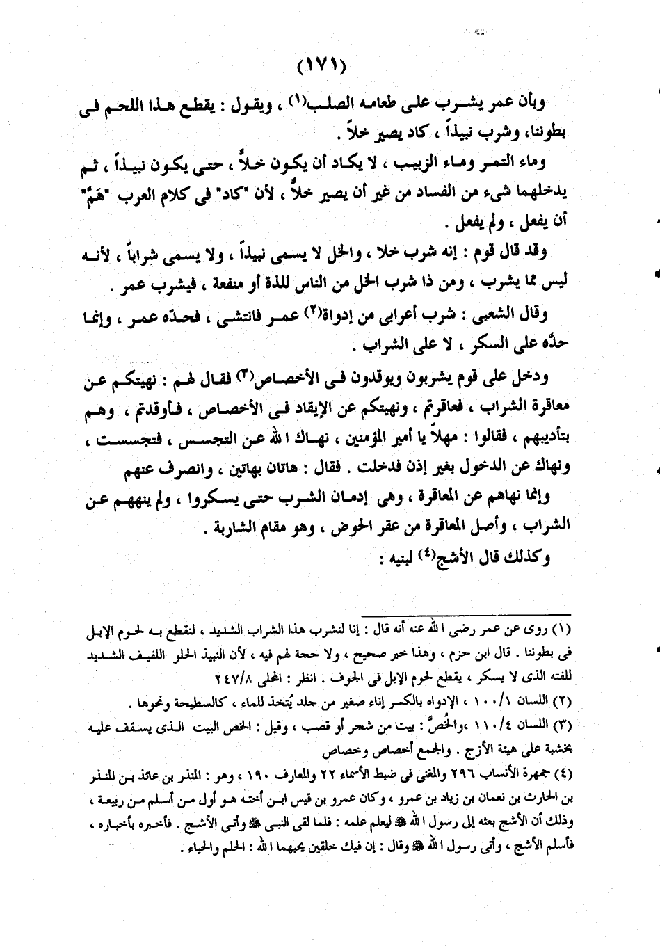 بان عُمَرَ كَانَ يَشْرَبُ عَلَى طَعَامِهِ الصلب ويقوليقطع هذا اللحم في بطوننا، ويشرب نبيذاُ كَادَ يَصِيرُ خَلًّا وَمَاءُ التمر وماء الزبيب لا يكادأ يَكُونَ خَلًّا حَتَّى يَكُونَ نَبِيذًا ثم يدخلها شَيْءٌ مِنَ الْفَسَادِ مِنْ غَيْرِ أن يصير خَلًّا، لِأَنَّ كَادَ فِي كَلَامِ الْعَرَبِ هَمَّ أَنْ يَفْعَلَ وَلَمْ يَفْعَلْ. وَقَدْ قَالَ قَوْمٌ: إِنَّهُ شَرِبَ خَلًّا، وَالْخَلُّ لَا يُسَمَّى نَبِيذًا، وَلَا يُسَمَّى شَرَابًا، لِأَنَّهُ مِمَّا يُشْرَبُ، وَمَنْ ذَا شَرِبَ الْخَلَّ مِنَ النَّاسِ لِلَذَّةٍ أَوْ مَنْفَعَةٍ فَيَشْرَبُهُ عُمَرُ. وَقَالَ الشَّعْبِيُّ شرب أعرابي من دواة عُمَرَ فَانْتَشَى فَحَدَّهُ عُمَرُ وَإِنَّمَا حَدَّهُ عَلَى السُّكْرِ لَا عَلَى الشُّرْبِ وَدَخَلَ عَلَى قَوْمٍ يَشْرَبُونَ وَيُوقِدُونَ فِي الْأَخْصَاصِ فَقَالَ لَهُمْ: نهتكم عن معاقرة الشراب فعقرتم، وَنَهَيْتُكُمْ عَنِ الْإِيقَادِ فِي الْأَخْصَاصِ فَأَوْقَدْتُمْ، وَهَمَّ بِتَأْدِيبِهِمْ، فَقَالُوا: مَهْلًا يَا أَمِيرَ الْمُؤْمِنِينَ، نَهَاكَ اللَّهُ عن لتجسس فَتَجَسَّسْتَ وَنَهَاكَ عَنِ الدُّخُولِ بِغَيْرِ إِذْنٍ فَدَخَلْتَ فَقَالَ هَاتَانِ بِهَاتَيْنِ وَانْصَرَفَ عَنْهُمْ، وَإِنَّمَا نَهَاهُمْ عَنِ الْمُعَاقَرَةِ وَهِيَ إِدْمَانُ الشُّرْبِ حَتَّى يَسْكَرُوا، وَلَمْ يَنْهَهُمْ عَنِ الشُّرْبِ وَأَصْلُ الْمُعَاقَرَةِ مِنْ عُقْرِ الْحَوْضِ وَهُوَ مَقَامُ الشَّارِبَةِ وَكَذَلِكَ قَالَ الأشج لبنيه: