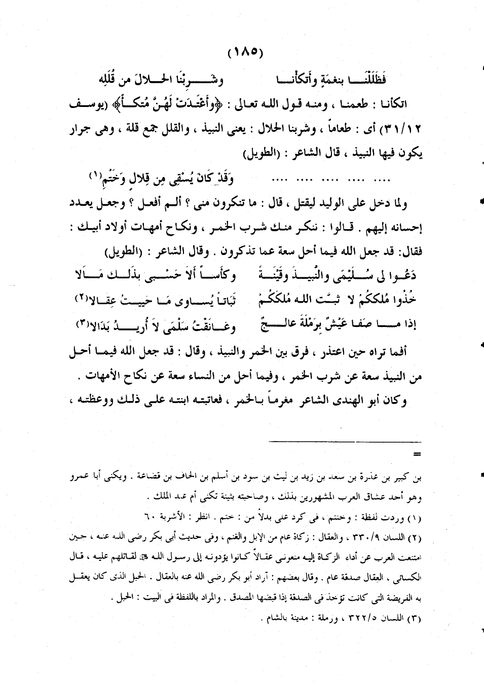 فظللنا بنعمة واتكأنا ... وشربنا الْحَلَالَ مِنْ قُلَلِهِ