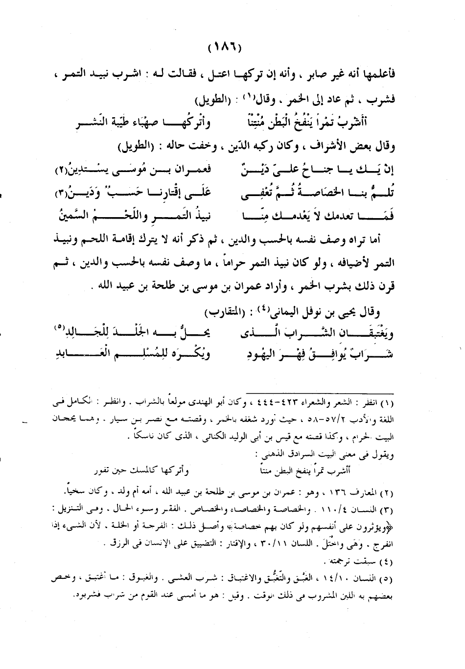 أَمَا تَرَاهُ وَصَفَ نَفْسَهُ بِالْحَسَبِ وَالدِّينِ ثُمَّ ذَكَرَ أَنَّهُ لَا يَتْرُكُ إِقَامَةَ اللَّحْمِ وَنَبِيذَ التَّمْرِ لِأَضْيَافِهِ، وَلَوْ كَانَ نَبِيذُ التَّمْرِ حَرَامًا مَا وَصَفَ نَفْسَهُ بِالْحَسَبِ وَالدِّينِ، ثُمَّ قَرَنَ ذَلِكَ بِشُرْبِ الْخَمْرِ وَأَرَادَ عمران ابن مُوسَى بْنِ طَلْحَةَ بْنِ عُبَيْدِ اللَّهِ وَقَالَ يَحْيَى بْنُ نَوْفَلٍ الْيَمَانِيُّ: