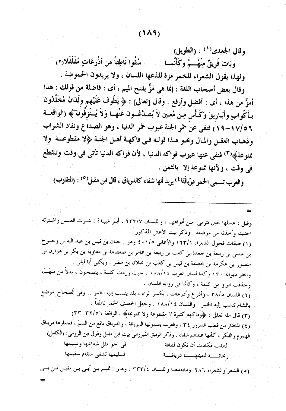 وَلِهَذَا يَقُولُ الشُّعَرَاءُ لِلْخَمْرِ مُزَّةٌ لِلَذْعِهَا اللِّسَانَ وَلَا يُرِيدُونَ الْحُمُوضَةَ. وَقَالَ بَعْضُ أَصْحَابِ اللُّغَةِ: إِنَّمَا هِيَ مَزَّةٌ بِفَتْحِ الْمِيمِ أَيْ فاضلة من قولهم هَذَا أَمَزُّ مِنْ هَذَا أَيْ افضل وأرفع وقال:) يَطُوفُ عَلَيْهِمْ وِلْدَانٌ مُخَلَّدُونَ بِأَكْوَابٍ وَأَبَارِيقَ وَكَأْسٍ مِنْ مَعِينٍ لا يصدعون عنها ولا ينزفون (فَنَفَى عَنْ خَمْرِ الْجَنَّةِ عُيُوبَ خمر الدنيا وهو الصداع ونفاد الشَّرَابِ وَذَهَابُ الْعَقْلِ وَالْمَالِ، وَنَحْوَ هَذَا قَوْلُهُ فِي فَاكِهَةِ أَهْلِ الْجَنَّةِ) لا مَقْطُوعَةٍ وَلا مَمْنُوعَةٍ (فَنَفَى عَنْهَا عُيُوبَ فَوَاكِهِ الدُّنْيَا لأنَّ فَوَاكِهَ الدُّنْيَا تَأْتِي فِي وقت وتنقطع في زقت، وَلِأَنَّهَا مَمْنُوعَةٌ إِلَّا بِالثَّمَنِ، وَالْعَرَبُ تُسَمِّي الْخَمْرَ دِرْيَاقَةٌ يُرِيدُ أَنَّهَا شِفَاءٌ كِالدِّرْيَاقِ.