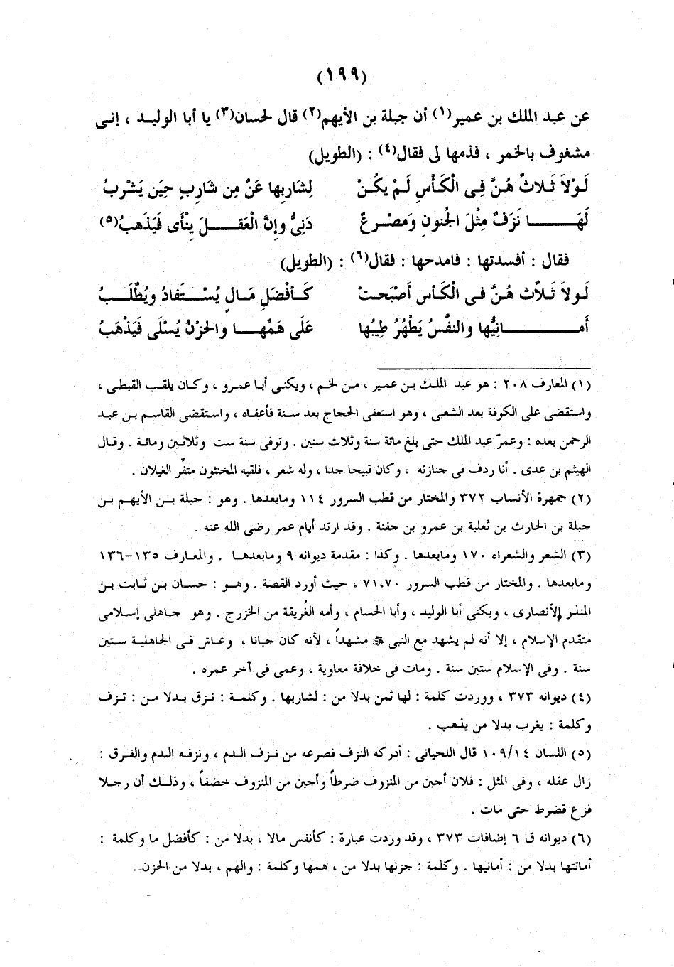 عن عبد الملك ابن عمير أنَّ جبلة ابن الْأَيْهَمِ قَالَ لِحَسَّانٍ يَا أَبَا الْوَلِيدِ إِنِّي مَشْغُوفٌ بِالْخَمْرِ فَذُمَّهَا لِي فَقَالَ: