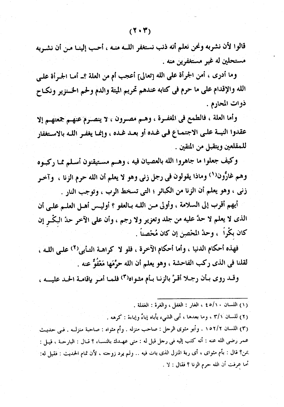 وَمَا أَدْرِي أَمِنَ الْجُرْأَةِ عَلَى اللَّهِ تَعَالَى أَعْجَبُ أَمْ مِنَ الْعِلَّةِ، أَمَّا الْجُرْأَةُ عَلَى اللَّهِ تعالى والإقدام عَلَى مَا حَرَّمَ فِي كِتَابِهِ عندهم تحريم الْمَيْتَةَ وَالدَّمَ وَلَحْمَ الْخِنْزِيرِ وَنِكَاحَ ذوات 1 - القشع والقشعة بيت من أدم أو جلد والقعقعة حكاية أصوات الجلود اليابسة 2 - الشمول كصبور الخمر أو الباردة منها كامشمولة الْمَحَارِمِ، وَأَمَّا الْعِلَّةُ فَالطَّمَعُ فِي الْمَغْفِرَةِ وَهُمْ مُصِرُّونَ لَا يَنْصَرِمُ عَنْهُمْ يَوْمُ جُمُعَتِهِمْ إِلَّا عَقَدُوا النِّيَّةَ عَلَى الِاجْتِمَاعِ فِي غَدِهِ أَوْ بَعْدَ غَدِهِ، وَإِنَّمَا يَغْفِرُ اللَّهُ بِالِاسْتِغْفَارِ لِلْمُقْلِعِينَ، وَيَتَقَبَّلُ مِنَ الْمُتَّقِينَ، وَكَيْفَ جَعَلُوا مَا جَاهَرُوا اللَّهَ بِالْعِصْيَانِ فِيهِ وَهُمْ مُسْتَيْقِنُونُ أَسْلَمَ مِمَّا رَكِبُوهُ وَهُمْ غَارَّونَ وَمَاذَا يَقُولُونَ فِي رَجُلٍ زَنَى وَهُوَ لَا يَعْلَمُ أَنَّ اللَّهَ حَرَّمَ الزِّنَا وَآخَرَ زَنَى وَهُوَ يَعْلَمُ أنَّ الزِّنَا مِنَ الْكَبَائِرِ الَّتِي تُسْخِطُ الرَّبَّ وَتُوجِبُ النَّارَ، أَيُّهُمْ أَقْرَبُ إِلَى السَّلَامَةِ، وَأَوْلَى من الله بالعفو، أو ليس أَهْلُ الْعِلْمِ عَلَى أنَّ الَّذِي لَا يَعْلَمُ لَا حَدَّ عَلَيْهِ من جلد وتعزير وَلَا رَجْمٍ، وَأَنَّ عَلَى الآخَرِ حَدَّ الْبِكْرِ إِنْ كَانَ بِكْرًا وَحَدَّ الْمُحْصَنِ إِنْ كَانَ مُحْصَنًا، فَهَذِهِ أَحْكَامُ الدُّنْيَا وَأَمَّا أَحْكَامُ الآخِرَةِ فَلَوْلَا كَرَاهَةُ التَّأَلِي عَلَى اللَّهِ لَقُلْنَا فِي الَّذِي رَكِبَ الْفَاحِشَةَ، وَهُوَ لَا يَعْلَمُ أنَّ اللَّهَ حَرَّمَهَا مَعْفُوٌّ عَنْهُ.