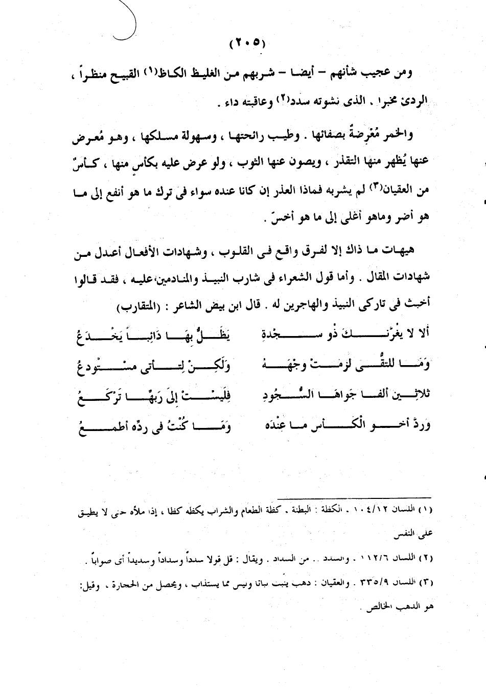 وَمِنْ عَجِيبِ شَأْنِهِمْ أَيْضًا شُرْبُهُمْ مِنْهُ الْغَلِيظَ الْكَاظَّ الْقَبِيحَ مَنْظَرًا، الردي مخبراً، الذي نشوته سدد، وَعَاقِبَتُهُ دَاءٌ، وَالْخَمْرُ مُعْرِضَةٌ بِصَفَائِهَا وَطِيبِ رَائِحَتِهَا، وَسُهُولَةِ مَسْلَكِهَا، وَهُوَ معرض عنها التقزز، وَيَصُونُ عَنْهَا الثَّوْبَ، وَلَوْ عُرِضَ عليه بكأس منها مِنَ الْعِقْيَانِ لَمْ يَشْرَبْهُ، فَمَاذَا الْعُذْرُ أنَّ كَانَا عِنْدَهُ سَوَاءٌ في الترك مَا هُوَ أَنْفَعُ إِلَى مَا هُوَ أَضَرُّ، وَمَا هُوَ أَغْلَى إِلَى مَا هُوَ أَخَسُّ، هَيْهَاتَ مَا ذَاكَ إِلَّا لِفَرَقٍ وَاقِعٍ فِي الْقُلُوبِ، وَشَهَادَاتُ الْأَفْعَالِ أَعْدَلُ مِنْ شَهَادَاتِ الْمَقَالِ. وَأَمَّا قَوْلُ الشُّعَرَاءِ فِي شَارِبِي النَّبِيذِ وَالْمُنَادِمِينَ عَلَيْهِ فَقَدْ قَالُوا أَخْبَثَ مِنْهُ فِي تَارِكِي النَّبِيذِ وَالْهَاجِرِينَ لَهُ قَالَ ابْنُ بِيضٍ الشَّاعِرُ: