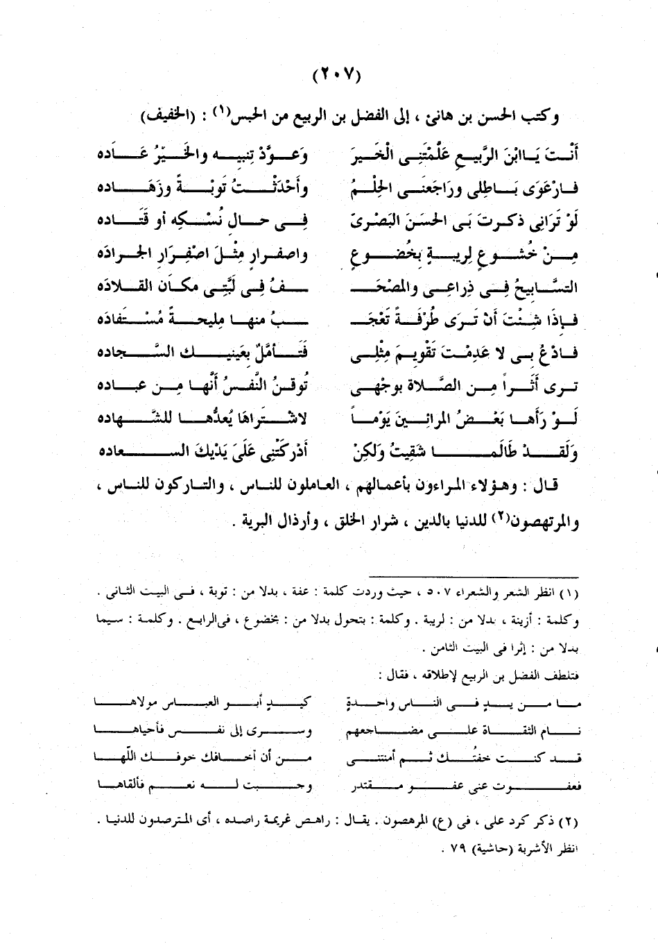 وَكَتَبَ الْحَسَنُ بْنُ هَانِئٍ إِلَى الْفَضْلِ بْنِ الرَّبِيعِ مِنَ الْحَبْسِ: