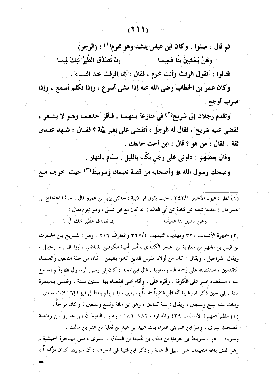 وَتَقَدَّمَ رَجُلَانِ إِلَى شُرَيْحٍ فِي مُنَازَعَةٍ بَيْنَهُمَا، فَأَقَرَّ أَحَدُهُمَا وَهُوَ لَا يَشْعُرُ، فقضى عليه شريخ، فقال له الرجل: أتقضني عَلَيَّ بِغَيْرِ بَيِّنَةٍ؟ فَقَالَ: شَهِدَ عِنْدِي ثِقَةٌ، فَقَالَ: مَنْ هُوَ؟ قَالَ: ابْنُ أُخْتِ خَالَتِكَ. وَقَالَ بَعْضُهُمْ دُلُّونِي عَلَى رَجُلٍ بَكَّاءٍ بِاللَّيْلِ بَسَّامٍ بِالنَّهَارِ. وَضَحِكَ رَسُولُ الله) وَأَصْحَابُهُ مِنْ قِصَّةِ نُعَيْمَانَ وَسُوَيْبِطٍ حين خرجا مع