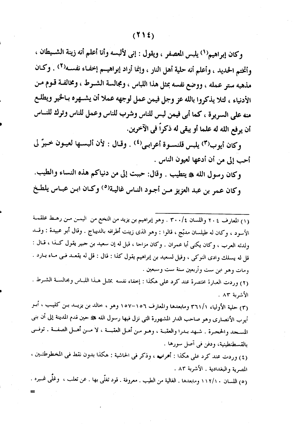 وَكَانَ إِبْرَاهِيمُ يَلْبَسُ الْمُعَصْفَرَ وَيَقُولُ: إِنِّي لَأَلْبَسُهُ وَأَنَا أَعْلَمُ أَنَّهُ زِينَةُ الشَّيْطَانِ، وَأَتَخَتَّمُ الْحَدِيدَ، وَأَعْلَمُ أَنَّهُ حِلْيَةُ أَهْلِ النَّارِ، وَإِنَّمَا أراد إبراهيم إخفاء نفسه بمثل ذلك اللِّبَاسِ، وَمُجَالَسَةَ الشُّرَطِ وَمُخَالَفَةَ قَوْمٍ مِنَ الْأَدْنِيَاءِ، لِئَلَّا يَذْكُرُوا بِاللَّهِ عز وجل فمن عَمِلَ لِوَجْهِهِ عَمَلًا أَنْ يُشْهِرَهُ بِالْخَيْرِ، وَيَطَّلِعَ مِنْهُ عَلَى السَّرِيرَةِ، كَمَا أَبَى فِيمَنْ لَبِسَ لِلنَّاسِ وَشَرِبَ لِلنَّاسِ وَعَمِلَ لِلنَّاسِ وَتَرَكَ لِلنَّاسِ أَنْ يَرْفَعَ اللَّهُ لَهُ عَلَمًا أَوْ يُبْقِيَ لَهُ ذِكْرًا فِي الْآخِرِينَ. وَكَانَ أَيُّوبُ يَلْبَسُ قلنسوة أفراب. وَقَالَ لِأَنْ أَلْبَسَهَا لِعُيُونِ خَيْرٍ أَحَبُّ إِلَيَّ مِنْ أنَّ أَدَعَهَا لِعُيُونِ النَّاسِ. وَكَانَ رَسُولُ اللَّهِ) يَتَطَيَّبُ وَقَالَ: قَدْ حُبِّبَ إِلَيَّ مِنْ دُنْيَاكُمْ هَذِهِ النِّسَاءُ وَالطِّيبُ. وَكَانَ عُمَرُ بْنُ عَبْدِ الْعَزِيزِ من أجود الناس غالية. كان ابن عباس يلطخ