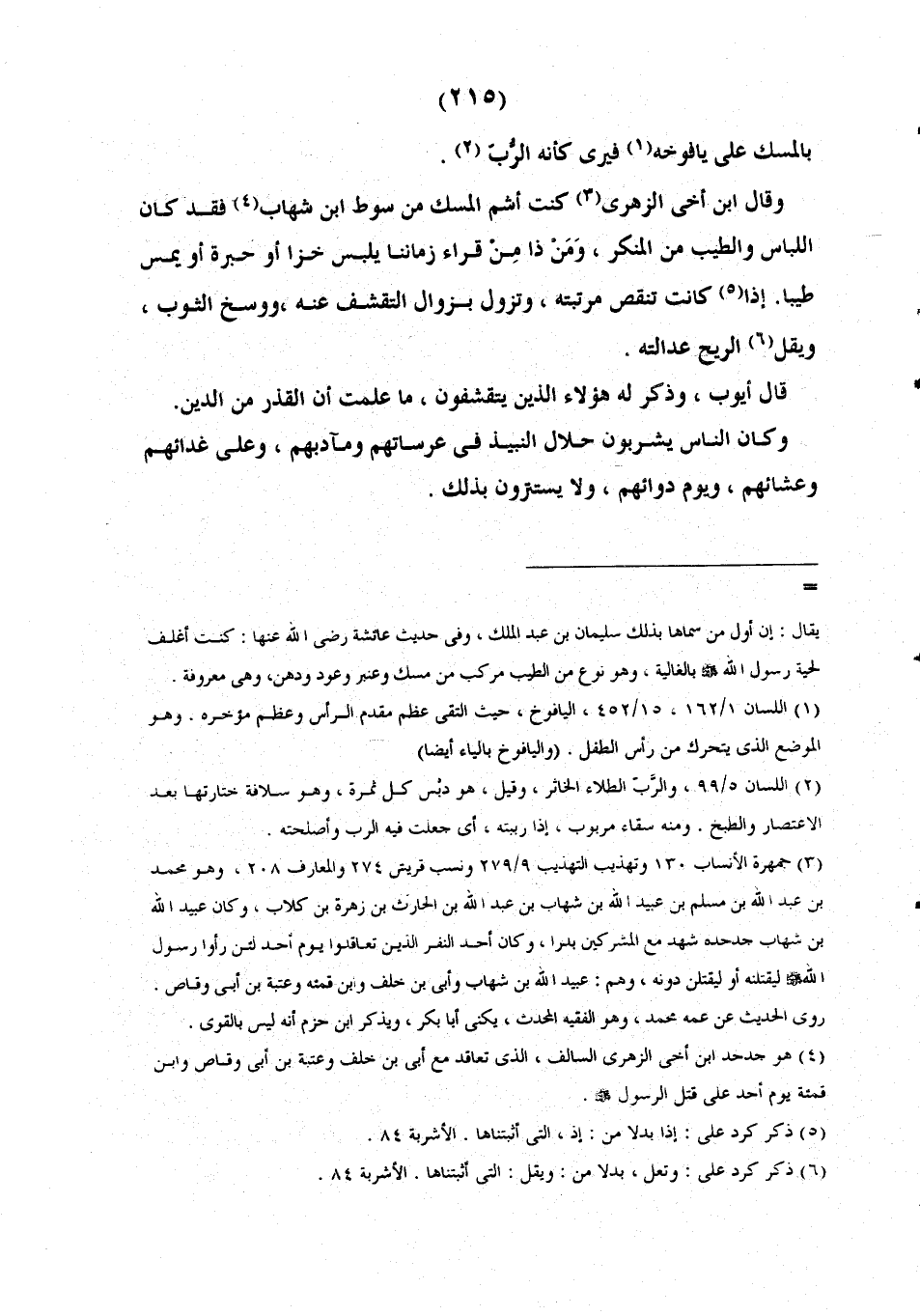 بِالْمِسْكِ عَلَى يَافُوخِهِ فَيُرَى كَأَنَّهُ الرُّبُّ وَقَالَ ابْنُ أَخِي الزُّهْرِيِّ: كُنْتُ أَشُمُّ الْمِسْكَ مِنْ سَوْطِ ابْنِ شِهَابٍ.