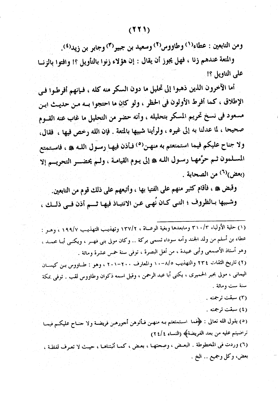 ومن التابعين عظاء وَطَاوُسُ وَسَعِيدُ بْنُ جُبَيْرٍ وَجَابِرُ بن زيد والمتعة عندهم زنا فَهَلْ يَجُوزُ أَنْ يُقَالَ: هَؤُلَاءِ زَنُوا بِالتَّأْوِيلِ وَأَفْتُوا بِالزِّنَا عَلَى التَّأْوِيلِ وَأَمَّا الْآخَرُونَ الَّذِينَ ذَهَبُوا إِلَى تَحْلِيلِ مَا دُونَ السُّكْرِ منه كله فانهم أفطروا فِي الْإِطْلَاقِ كَمَا أَفْرَطَ الْأَوَّلُونَ فِي الْحَظْرِ وَلَوْ كَانَ مَا احْتَجُّوا بِهِ مِنْ حَدِيثِ ابْنِ مِسْعُودٍ فِي نَسْخِ تَحْرِيمِ الْمُسْكِرِ بِتَحْلِيلِهِ وَأَنَّهُ حَضَرَ مِنَ التَّحْلِيلِ مَا غَابَ عَنْهُ الْقَوْمُ صَحِيحًا عَدَلْنَا بِهِ إِلَى غَيْرِهِ وَلَرَأَيْنَاهُ شبيها بالمتعة فان الله رَخَّصَ فِيهَا فَقَالَ: وَلَا جُنَاحَ عَلَيْكُمْ فِيمَا اسْتَمْتَعْتُمْ بِهِ مِنْهُنَّ، فَأَذِنَ فِيهَا رَسُولُ اللَّهِ صَلَّى الله عليه وآله وَسَلَّمَ فَاسْتَمْتَعَ الْمُسْلِمُونَ ثُمَّ حَرَّمَهَا رَسُولَ اللَّهِ صَلَّى اللَّهُ عَلَيْهِ وآله وَسَلَّمَ إِلَى يَوْمِ الْقِيَامَةِ وَلَمْ يَحْضُرِ التَّحْرِيمَ إِلَّا الْبَعْضُ مِنَ الصَّحَابَةِ وَقُبِضَ صَلَّى اللَّهُ عَلَيْهِ وآله وَسَلَّمَ فَأَقَامَ كَثِيرٌ مِنْهُمْ عَلَى الْفُتْيَا بِهَا وَاتَّبَعَهُمْ عَلَى ذَلِكَ قَوْمٌ مِنَ التَّابِعِينَ. وَشَبِيهًا بِالظُّرُوفِ الَّتِي كَانَ نَهَى عَنِ الِانْتِبَاذِ فِيهَا ثُمَّ أَذِنَ فِي ذَلِكَ