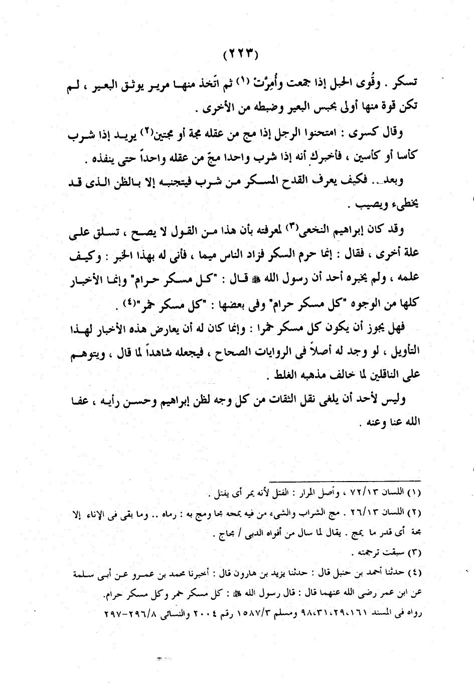 وقد كَانَ إِبْرَاهِيمُ النَّخَعِيُّ لِمَعْرِفَتِهِ بِأَنَّ هَذَا مِنَ الْقَوْلِ لَا يَصِحُّ تساق عَلَى عِلَّةٍ أُخْرَى فَقَالَ: إِنَّمَا حُرِّمَ السُّكْرُ فَزَادَ النَّاسُ مِيمًا فَأَنَّى لَهُ بِهَذَا الْخَبَرُ وَكَيْفَ علمه ولم يخبره أَحَدٌ أَنَّ رَسُولَ اللَّهِ صَلَّى الله عليه وآله وَسَلَّمَ قَالَ كُلُّ مُسْكِرٍ حَرَامٌ وَإِنَّمَا الْأَخْبَارُ كُلُّهَا مِنَ الْوُجُوهِ كُلُّ مُسْكِرٍ حَرَامٌ وَفِي بَعْضِهَا كُلُّ مُسْكِرٌ خَمْرٌ فَهَلْ يَجُوزُ أن يكون كل مسكر خَمْرًا وَإِنَّمَا كَانَ لَهُ أَنْ يُعَارِضَ هَذِهِ الْأَخْبَارَ بِهَذَا التَّأْوِيلِ لَوْ وَجَدَ لَهُ أَصْلًا فِي الرِّوَايَاتِ الصِّحَاحِ فَيَجْعَلَهُ شَاهِدًا لِمَا قَالَ وَيَتَوَهَّمُ عَلَى النَّاقِلِينَ لَمَّا خَالَفَ مَذْهَبُهُ الْغَلَطَ وَلَيْسَ لِأَحَدٍ أَنْ يُلْغِيَ نَقْلَ الثِّقَاتِ مِنْ كُلِّ وَجْهٍ لِظَنِّ إِبْرَاهِيمَ وَحُسْنِ رَأْيِهِ عَفَا اللَّهُ عَنَّا وَعَنْهُ.
