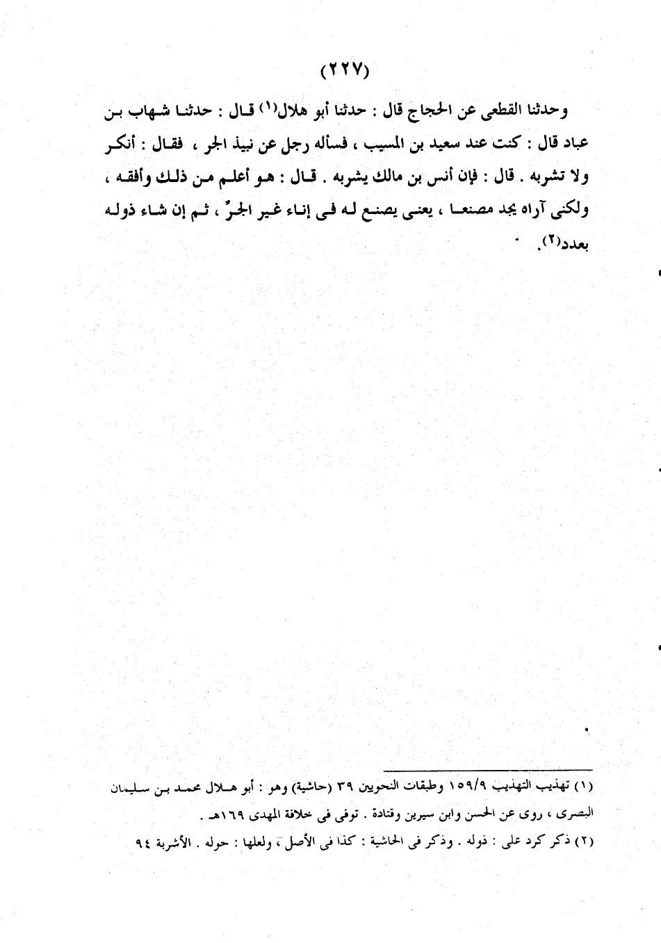 وحدثنا القطيعي عَنِ الْحَجَّاجِ قَالَ حَدَّثَنَا أَبُو هِلَالٍ قَالَ: حَدَّثَنَا شِهَابُ بْنُ عَبَّادٍ قَالَ: كُنْتُ عِنْدَ سَعِيدِ ابن المسيب فسأله رجل عن النبيذ الْجَرِّ فَقَالَ: انْكِرْهُ وَلَا تَشْرَبْهُ قَالَ فَإِنَّ أَنَسَ بْنَ مَالِكٍ يَشْرَبُهُ قَالَ هُوَ أَعْلَمُ مِنْ ذَلِكَ وَأَفْقَهُ وَلَكِنِّي أَرَاهُ يَجِدُ مصنعا يعني لَهُ فِي إِنَاءٍ غَيْرَ الْجَرِّ ثم إن شاء دوله بعد ذلك في الجر.