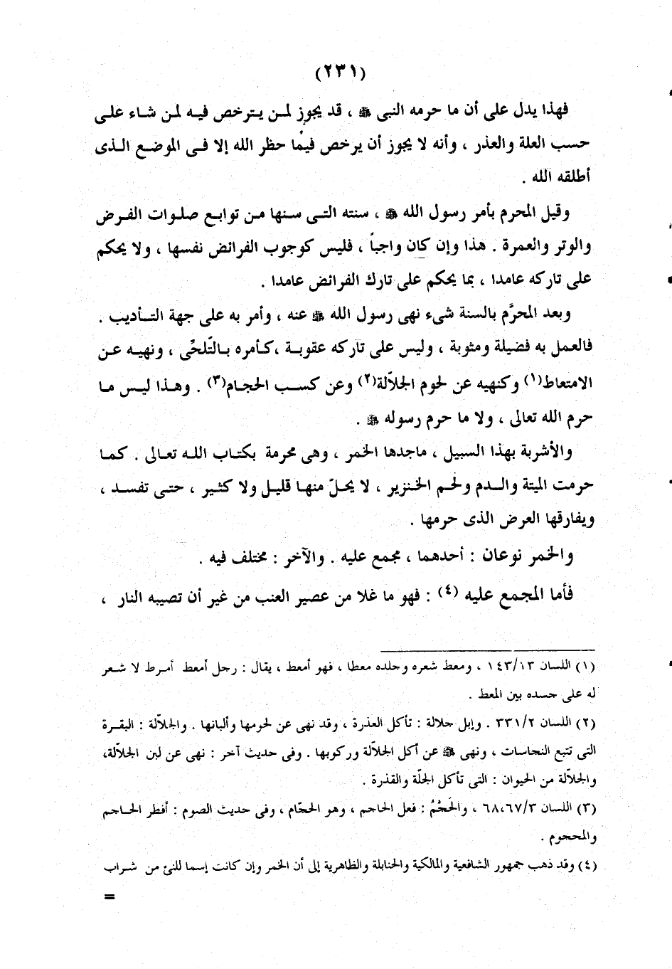 والأشربة بهذا السبيل ما حداه الْخَمْرُ وَهِيَ مُحَرَّمَةٌ بِكِتَابِ اللَّهِ تَعَالَى كَمَا حُرِّمَتِ الْمَيْتَةُ وَالدَّمُ ولحم الخنزير لا يَحِلُّ مِنْهَا قَلِيلٌ وَلَا كَثِيرٌ حَتَّى تَفْسُدَ وَيُفَارِقَهَا الْعَرَضُ الَّذِي حرمها.