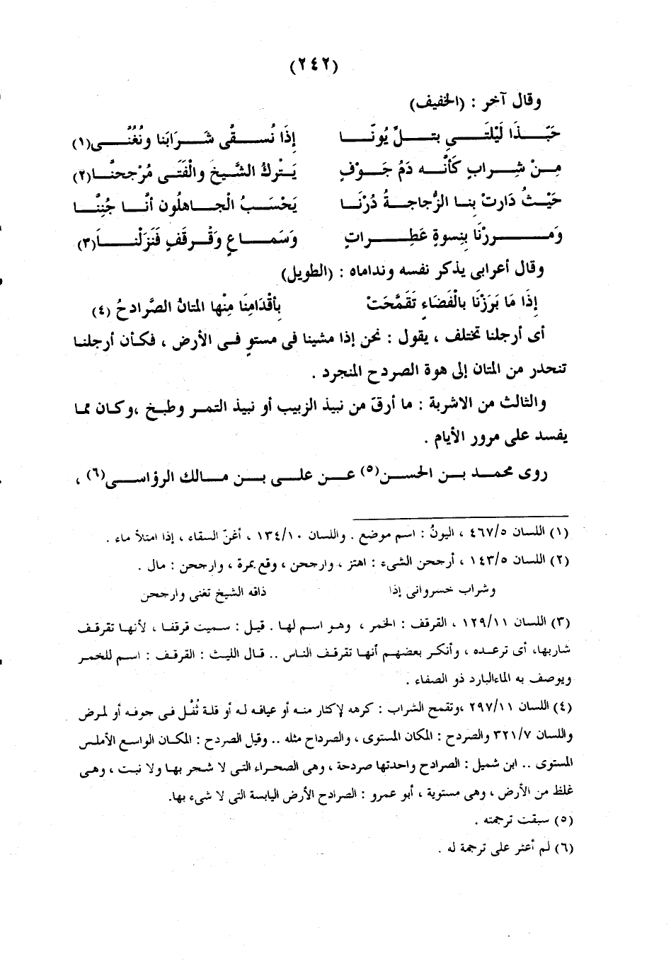 مِنْ شَرَابٍ كَأَنَّهُ دَمُ جَوْفٍ ... يَتْرُكُ الشَّيْخَ وَالْفَتَى مُرْجَحِنَّا